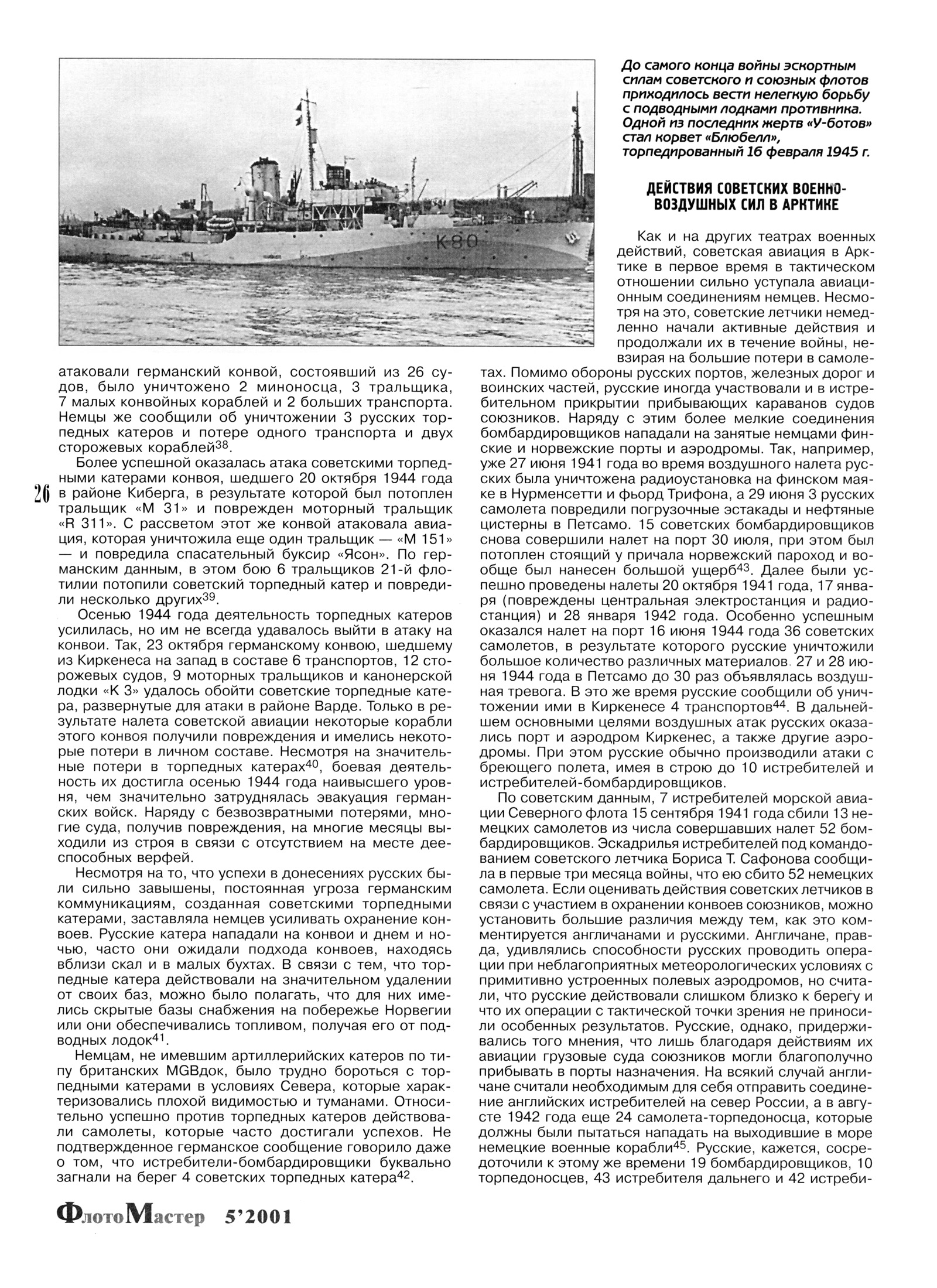 {22 В период с августа по декабрь 1941 г. в операционной зоне СФ с базированием на Полярное действовали в общей сложности 4 британские субмарины. Их успехи выразились в потоплении 2 охотников за ПЛ и 7 торговых судов (17.888 брт). Впоследствии лодки союзников заходили в нашу операционную зону только в ходе операций по обеспечению переходов «северных» конвоев. Фактов результативных атак союзных ПЛ в ходе данных операций не было. В своей операционной зоне у побережья Норвегии союзные ПЛ потопили (без учета минных постановок) 1 судно (4360 брт) в 1941 г., 5 судов (16.120 брт) в 1942 г., 2 ПЛ и 3 судна (10.146 брт) в 1943 г., З ПЛ, 1 ТЩ, 1 БО и 14 судов (36.787 брт) в 1944 г., а также 2 ПЛ, 1 СКР, 1 ТЩ и 3 судна (2997 брт) в 1945 г.}.