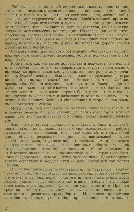 Ясно, что интересы народного хозяйства Сибири и дальнейшего под’ема ее производительных сил повелительно требуют использования всех транспортных возможностей, которые в той или иной мере разрешают вопрос при наименьшей затрате средств и времени, и удовлетворяют требованиям: а) дешевого выхода на внешние рынки дешевых массовых сибирских товаров;