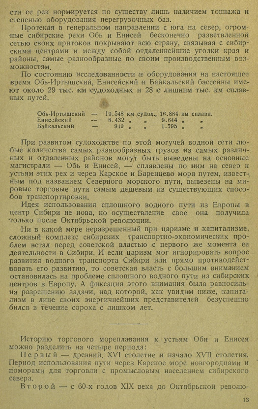 Ни в какой мере неразрешенный при царизме и капитализме, сложный комплекс сибирских транспортно-экономических проблем встал перед советской властью с первого же момента ее деятельности в Сибири. И если царизм мог игнорировать вопрос развития водного транспорта Сибири или прямо противодействовать его развитию, то советская власть с большим вниманием остановилась на проблеме сплошного водного пути из сибирских центров в Европу. А фиксация этого внимания была равносильна разрешению задачи, над которой, как увидим ниже, капитализм в лице своих энергичнейших представителей безуспешно бился в течение сорока с лишком лет.