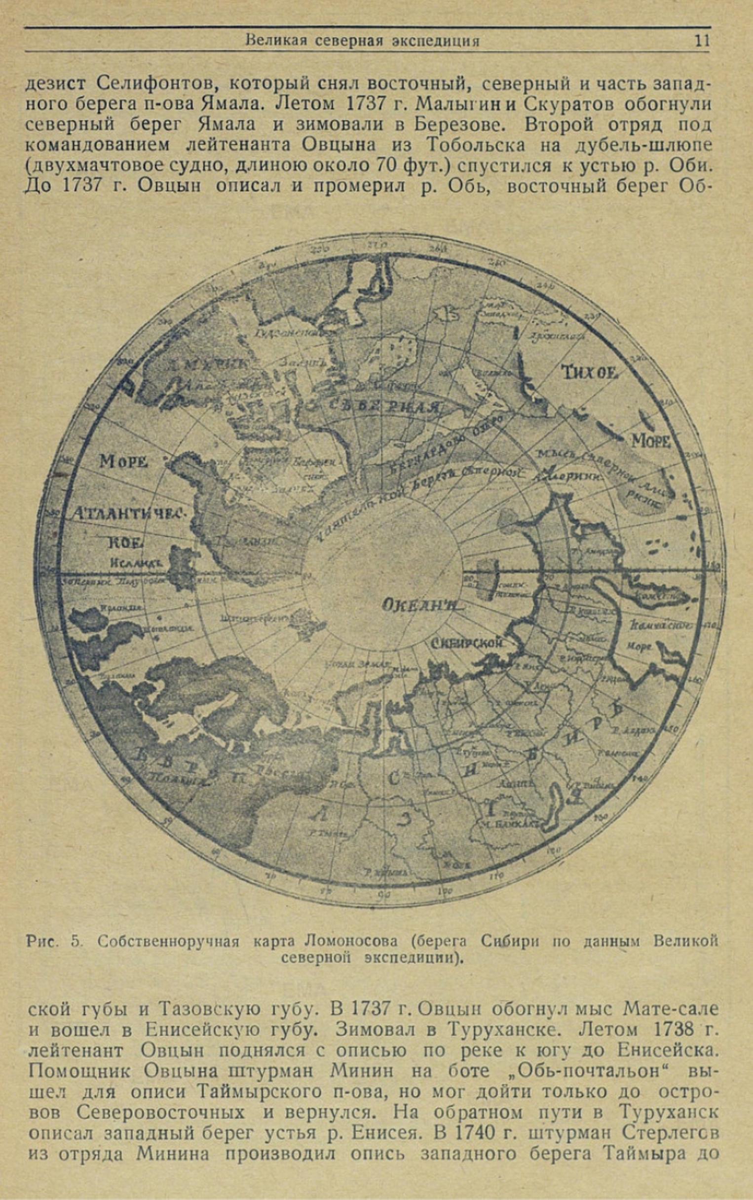 дезист Селифонтов, который снял восточный, северный и часть западного берега п-ова Ямала. Летом 1737 г. Малыгин и Скуратов обогнули северный берег Ямала и зимовали в Березове. Второй отряд под командованием лейтенанта Овцына из Тобольска на дубель-шлюпе (двухмачтовое судно, длиною около 70 фут.) спустился к устью р. Оби. До 1737 г. Овцын описал и промерил р. Обь, восточный берег Обской губы и Тазовскую губу. В 1737 г. Овцын обогнул мыс Мате-сале и вошел в Енисейскую губу. Зимовал в Туруханске. Летом 1738 г. лейтенант Овцын поднялся с описью по реке к югу до Енисейска. Помощник Овцына штурман Минин на боте „Обь-почтальон“ вышел для описи Таймырского п-ова, но мог дойти только до островов Северовосточных и вернулся. На обратном пути в Туруханск описал западный берег устья р. Енисея. В 1740 г. штурман Стерлегов из отряда Минина производил опись западного берега Таймыра до
