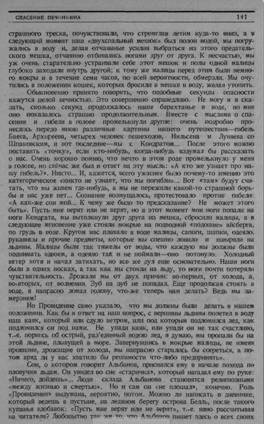 Сон, о котором говорит Альбанов, приснился ему в начале похода по пловучим льдам. Он увидел во сне «старичка», который нагадал ему по руке: «Ничего, дойдешь»... Люди склада Альбанова становятся религиозными «между жизнью и смертью». Но и сам он «не плошал», конечно. Роль «Провидения» выдумана, вероятно, потом. Можно ли написать в дневнике, который ведешь в пустыне, на ледяном берегу острова Белль, после такого купанья вдобавок: «Пусть мне верят или не верят», т. -е. явно рассчитывая на читателя? Любопытно так жe то, что Альбанов пишет здесь о всех своих