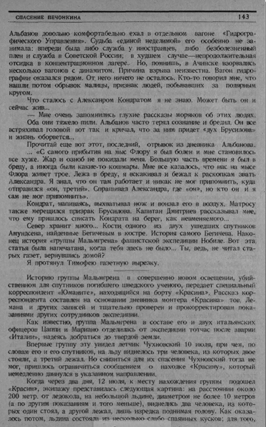 Север хранит много... Кости одного из двух ушедших спутников Амундсена, найденные Бегичевым в костре. История самого Бегичева. Наконец история «группы Мальмгрена» фашистской экспедиции Нобиле. Вот эта статья была напечатана, когда тебя здесь не было... Ты, ведь, не читал старых газет, вернувшись домой?