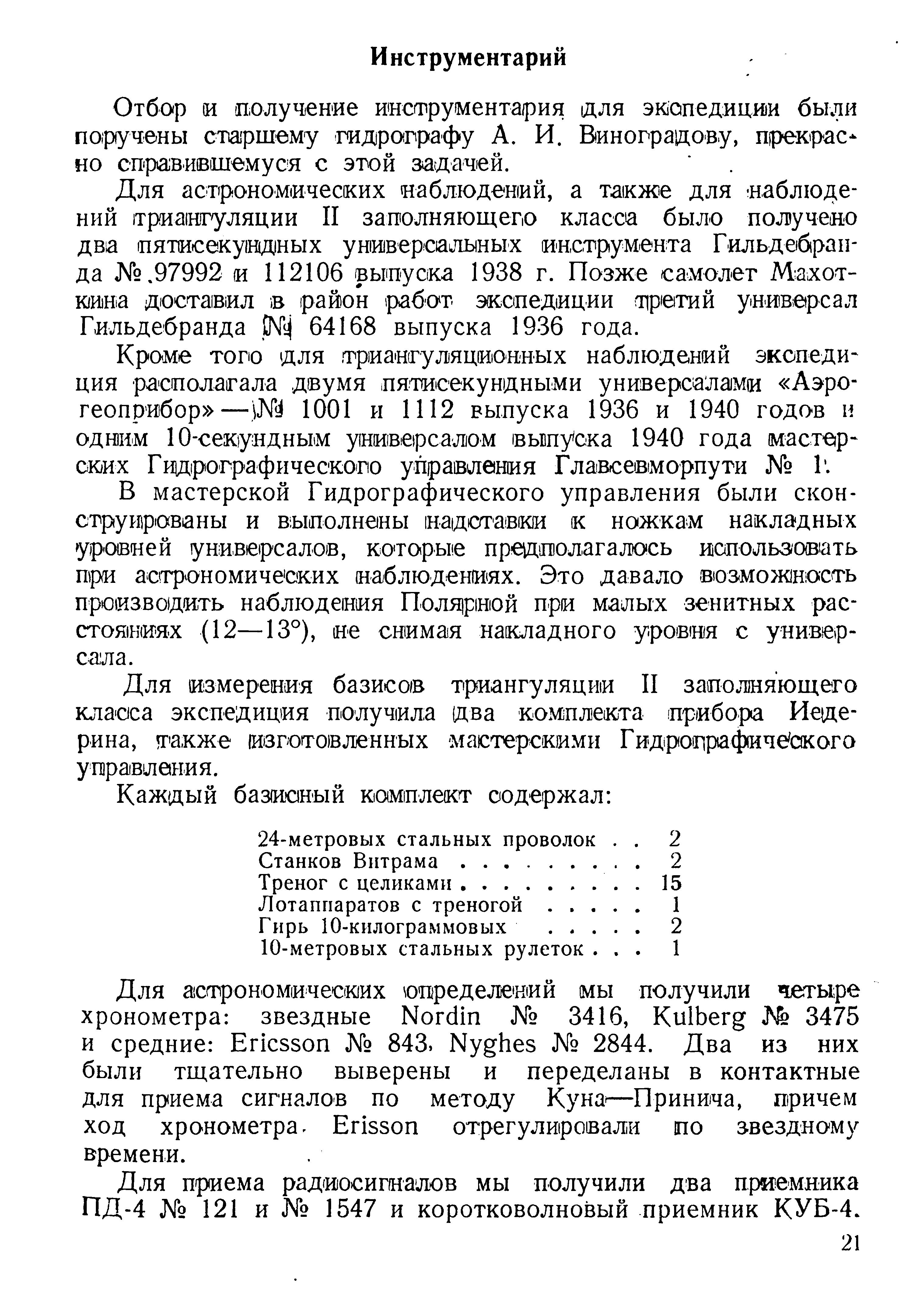 Для астрономических наблюдений, а также для наблюдений триангуляции II заполняющего класса было получено два пятисекундных универсальных инструмента Гильдебранда № 97992 и 112106 выпуска 1938 г. Позже самолет Махоткина доставил в район работ экспедиции третий универсал Гильдебранда № 64168 выпуска 1936 года.