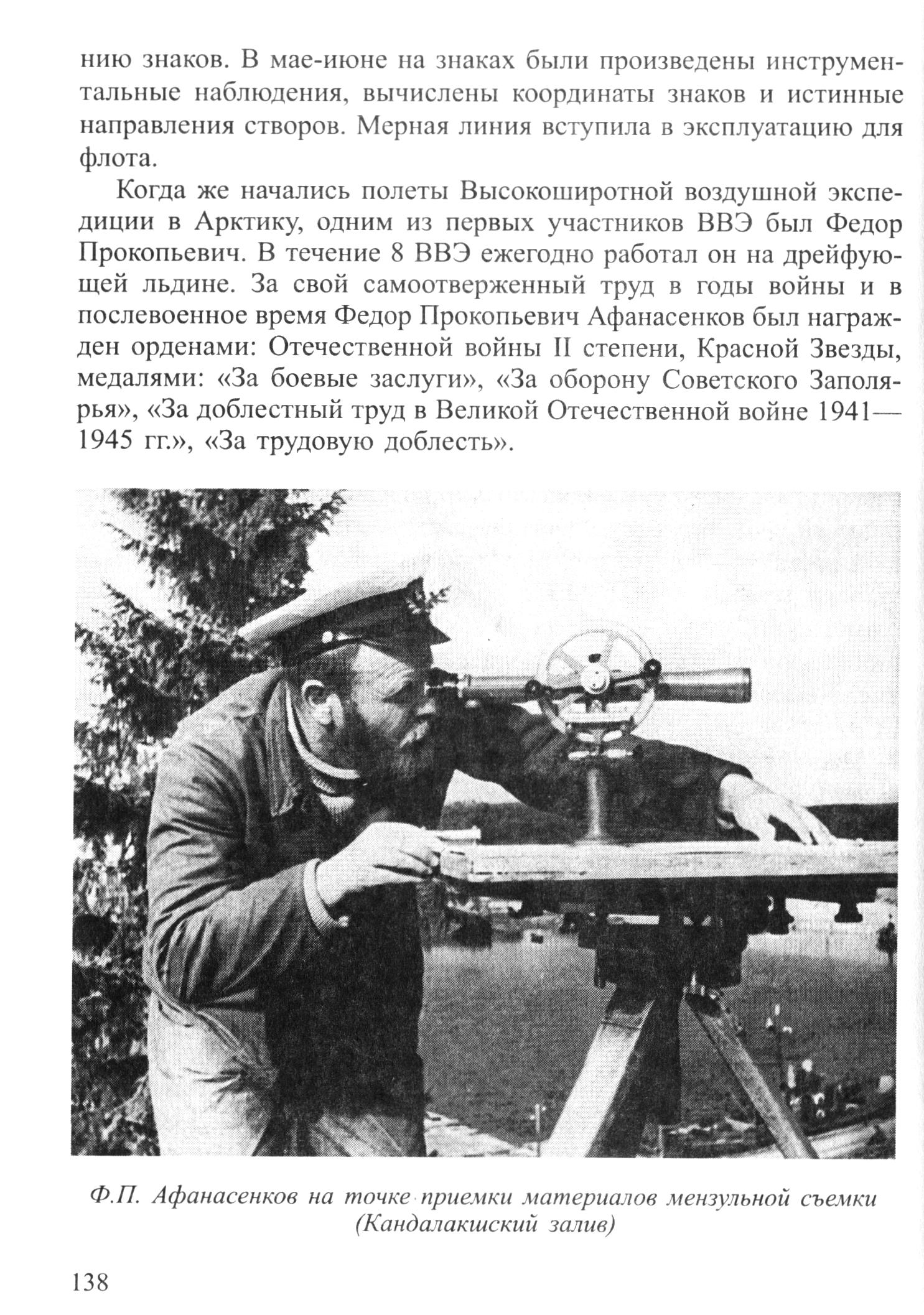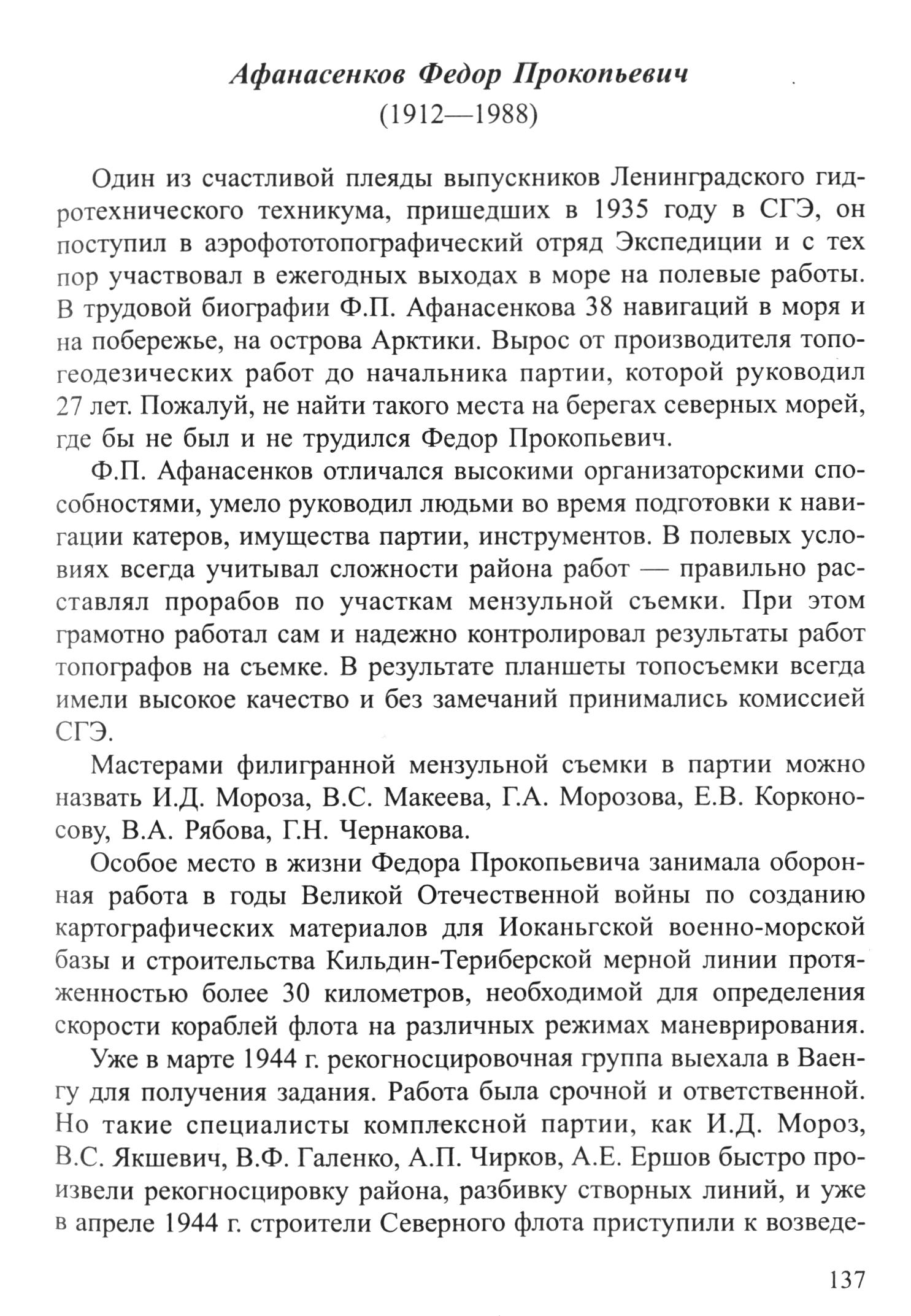 В трудовой биографии Ф. П. Афанасенкова 38 навигаций в моря и на побережье, на острова Арктики. Вырос от производителя топо-геодезических работ до начальника партии, которой руководил 27 лет. Пожалуй, не найти такого места на берегах северных морей, где бы не был и не трудился Федор Прокопьевич.