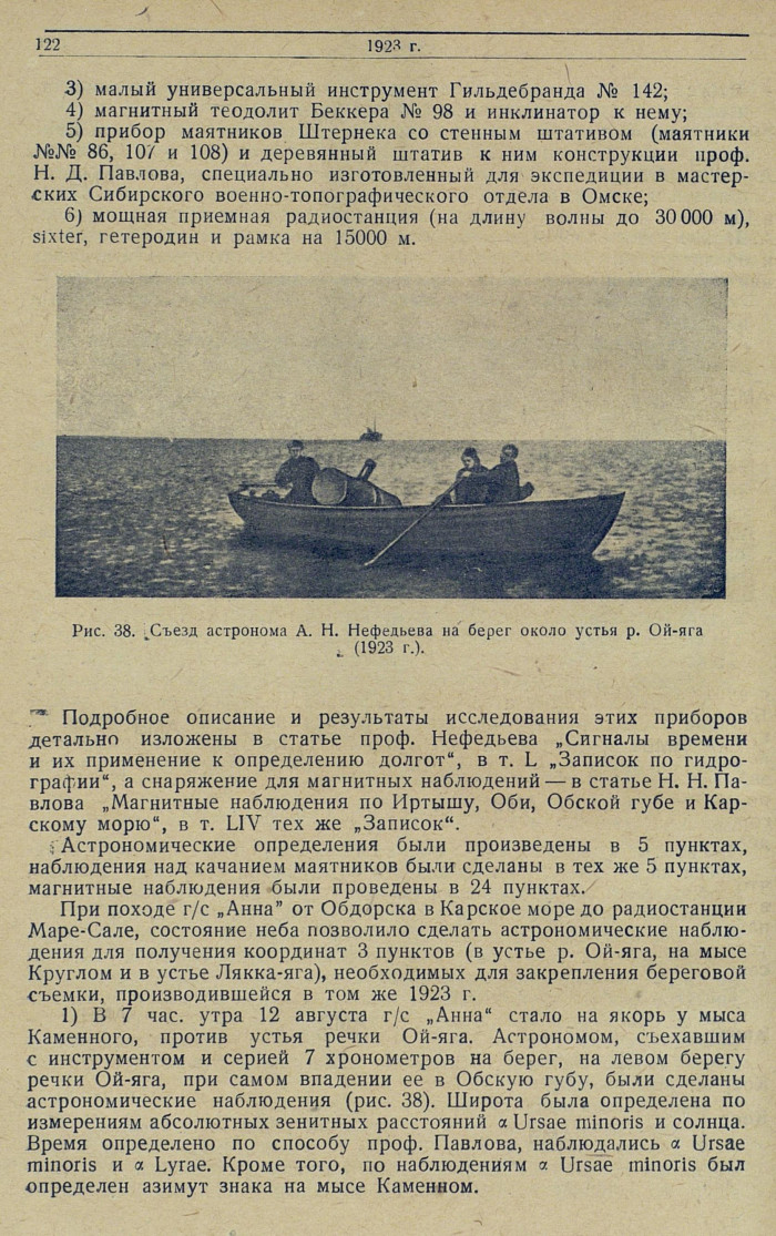 Подробное описание и результаты исследования этих приборов детально изложены в статье проф. Нефедьева „Сигналы времени и их применение к определению долгот", в т. L „Записок по гидрографии", а снаряжение для магнитных наблюдений — в статье Н. Н. Павлова „Магнитные наблюдения по Иртышу, Оби, Обской губе и Карскому морю", в т. LIV тех же „Записок".