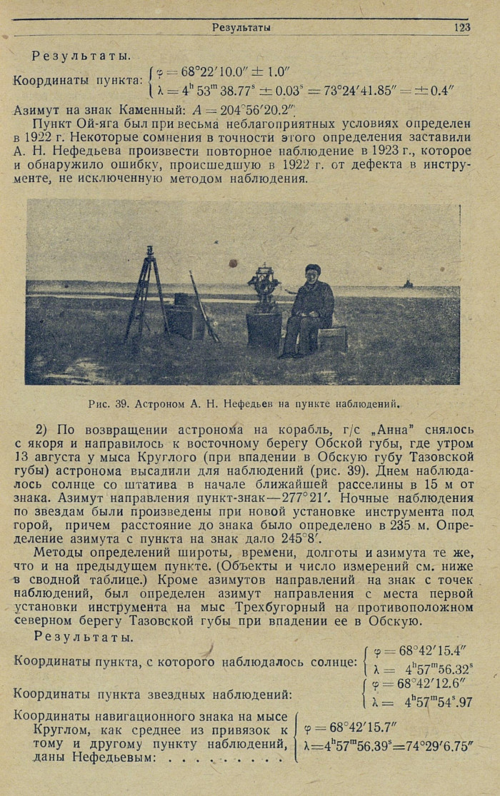 Пункт Ой-яга был при весьма неблагоприятных условиях определен в 1922 г. Некоторые сомнения в точности этого определения заставили А. Н. Нефедьева произвести повторное наблюдение в 1923 г., которое и обнаружило ошибку, происшедшую в 1922 г. от дефекта в инструменте, не исключенную методом наблюдения.