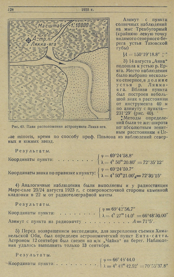 3) 14 августа „Анна" подошла к устью р. Ер-яга. Место наблюдения было выбрано несколько севернее, в долине устья р. Лякка-яга. Вблизи пункта был построен небольшой знак в расстоянии, от инструмента 40 м по азимуту с пункта — 231°29' (рис. 40).