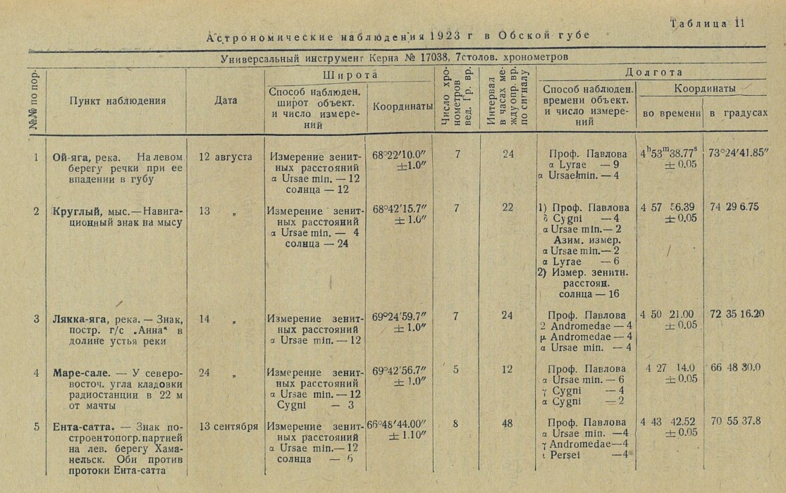 При походе г/с „Анна” от Обдорска в Карское море до радиостанции Маре-Сале, состояние неба позволило сделать астрономические наблюдения для получения координат 3 пунктов (в устье р. Ой-яга, на мысе Круглом и в устье Лякка-яга), необходимых для закрепления береговой съемки, производившейся в том же 1923 г.