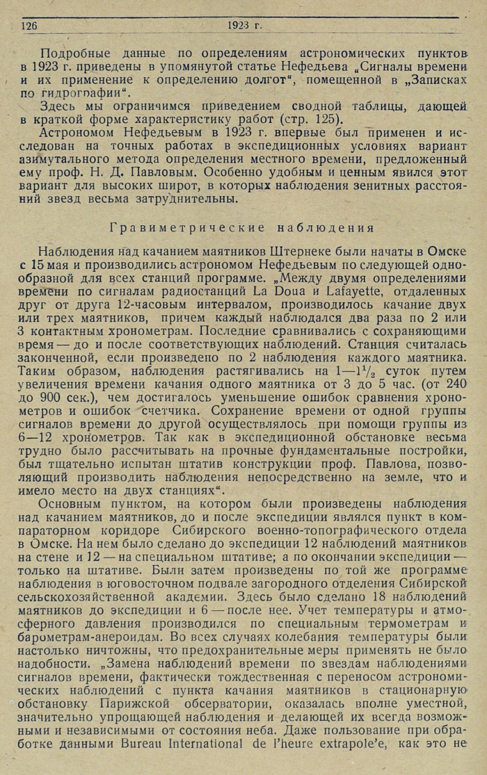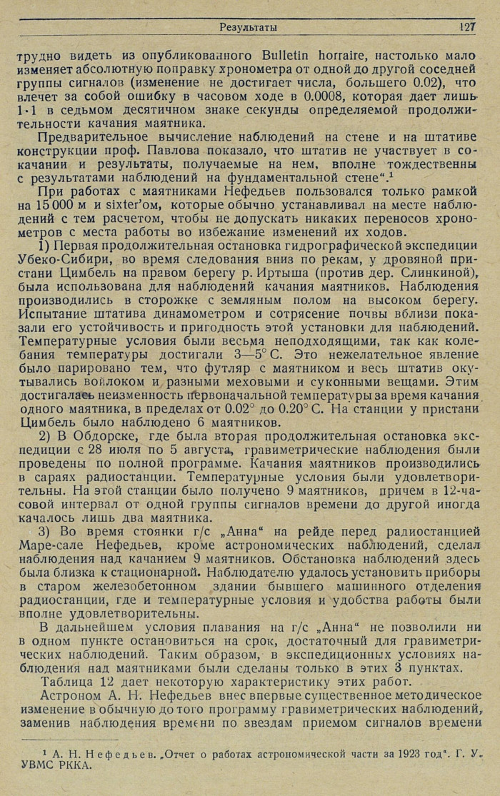 Bureau International de I’heure, чем самые наблюдения становятся вне зависимости от состояния неба. К сожалению, преждевременная смерть не дала Александру Николаевичу Нефедьеву закончить обработку всего материала работ 1923 г. Безусловно он представляет интерес не только в качестве научного результата, но и с точки зрения наблюдательской практики в заполярных условиях.