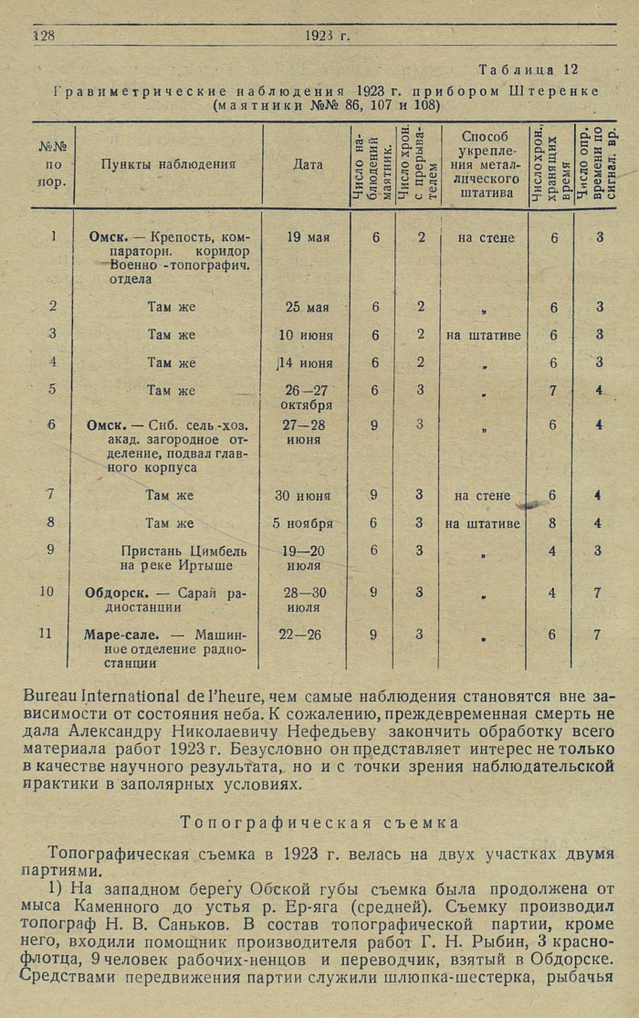 Основным пунктом, на котором были произведены наблюдения над качанием маятников, до и после экспедиции являлся пункт в компараторном коридоре Сибирского военно-топографического отдела в Омске. На нем было сделано до экспедиции 12 наблюдений маятников на стене и 12 — на специальном штативе; а по окончании экспедиции — только на штативе. Были затем произведены по той же программе наблюдения в юговосточном подвале загородного отделения Сибирской сельскохозяйственной академии. Здесь было сделано 18 наблюдений маятников до экспедиции и 6 — после нее. Учет температуры и атмосферного давления производился по специальным термометрам и барометрам-анероидам. Во всех случаях колебания температуры были настолько ничтожны, что предохранительные меры применять не было надобности. „Замена наблюдений времени по звездам наблюдениями сигналов времени, фактически тождественная с переносом астрономических наблюдений с пункта качания маятников в стационарную обстановку Парижской обсерватории, оказалась вполне уместной, значительно упрощающей наблюдения и делающей их всегда возможными и независимыми от состояния неба. Даже пользование при обработке данными Bureau International de I'heure extrapole'e, как это не