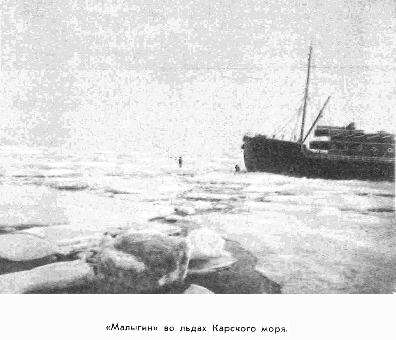 На следующий день «Малыгина» зажали сплошные мощные торосистые льды, по которым можно было свободно ходить и удаляться на значительное расстояние от корабля. Погода стояла почти безоблачная, с легким морозцем.