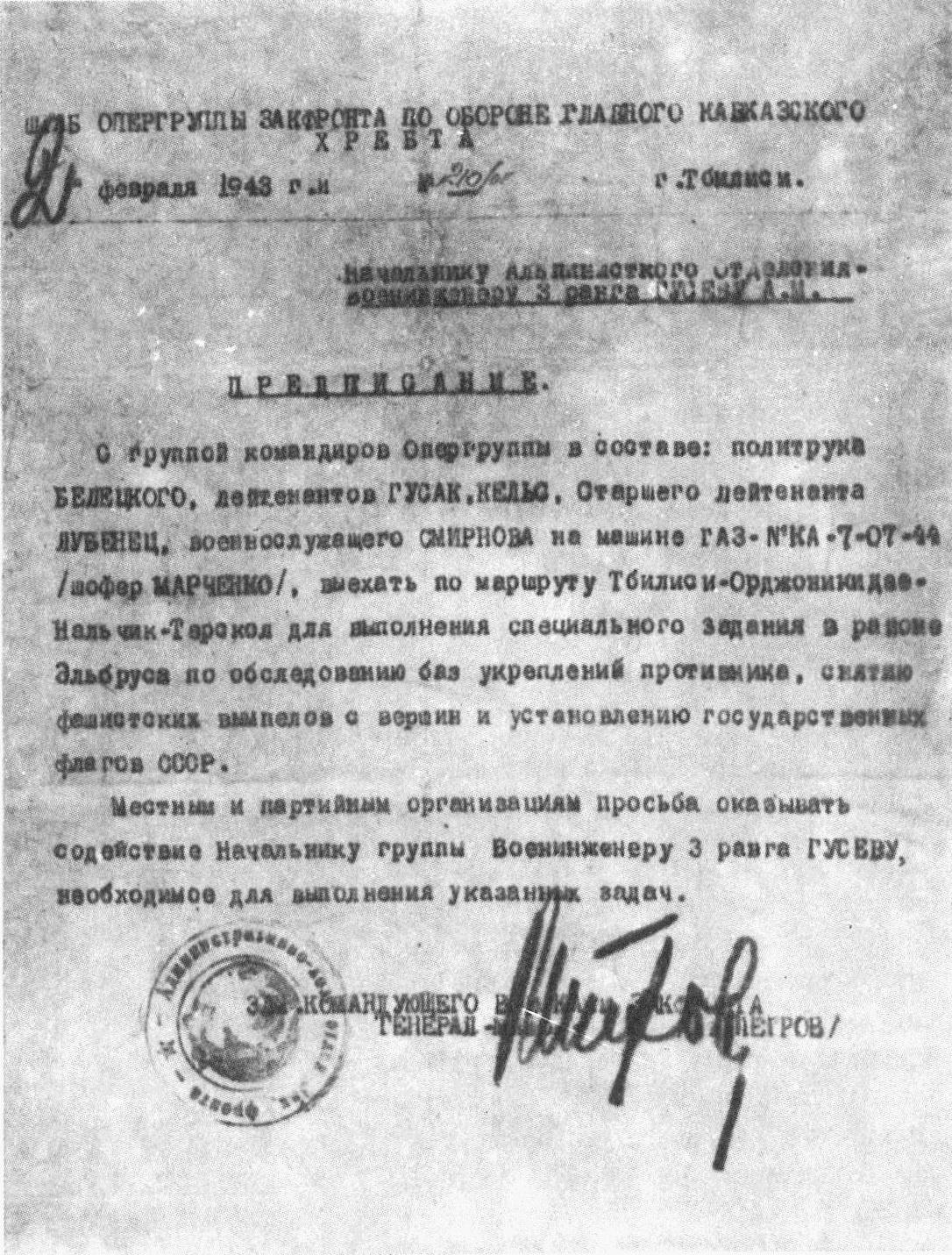 Для обеспечения руководства действиями наших войск на перевалах при штабе Закавказского фронта была создана оперативная группа, в состав которой входило специальное альпинистское отделение. По приказу командования я возглавил это отделение, которому 2 февраля 1943 г. поручили в ознаменование начавшегося освобождения Кавказа сбросить фашистские флаги с вершин Эльбруса и установить на них флаги Советского государства.