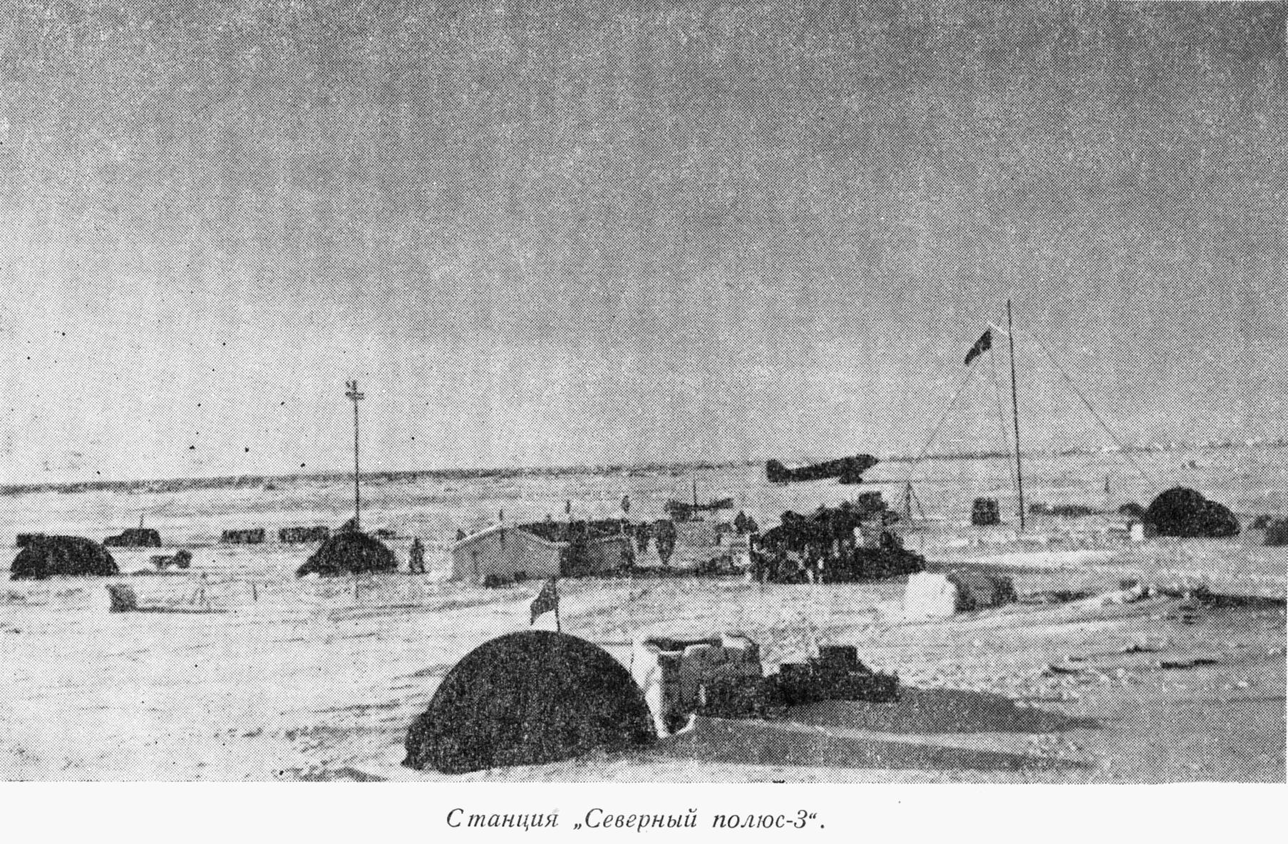 ... Еще несколько дней назад льдина была пустынной, а сейчас, 16 апреля, тут уже целый поселок. Прежде всего установили палатки для аэрологов, метеорологов, магнитолога, а также под радиостанцию и камбуз. Из снежных кирпичей построили астрономический павильон. В палатках поставлены изящные и очень удобные столики, оборудованы рабочие места для сотрудников. Ритмично тарахтит моторчик радиостанции. Ее «заведующий» Курко со своим молодым помощником Разбашем дают радиопривод самолетам полярной авиации, занятым перевозкой грузов с Большой Земли на дрейфующую льдину.