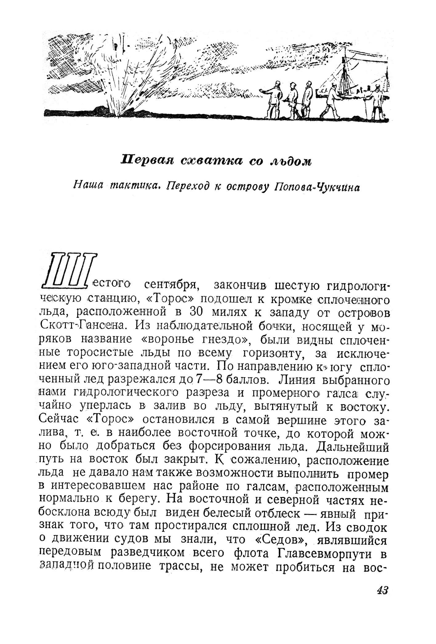 Как бы в подтверждение нашего намерения произвести разведку в прибрежных льдах нами было получено из Гидрографического управления телеграфное распоряжение: «В случае улучшения ледовых условий подойдите к острову Попова-Чукчина для розысков остатков экспедиции геолога Русанова», исчезнувшего вместе со своим кораблем «Геркулес» в 1912 году». Не теряя времени, «Торос» повернул на юг и вошел в семибалльный крупно- битый торосистый лед. Я с большим нетерпением ждал этого момента, так как впервые видел работу деревянного корабля во льдах.