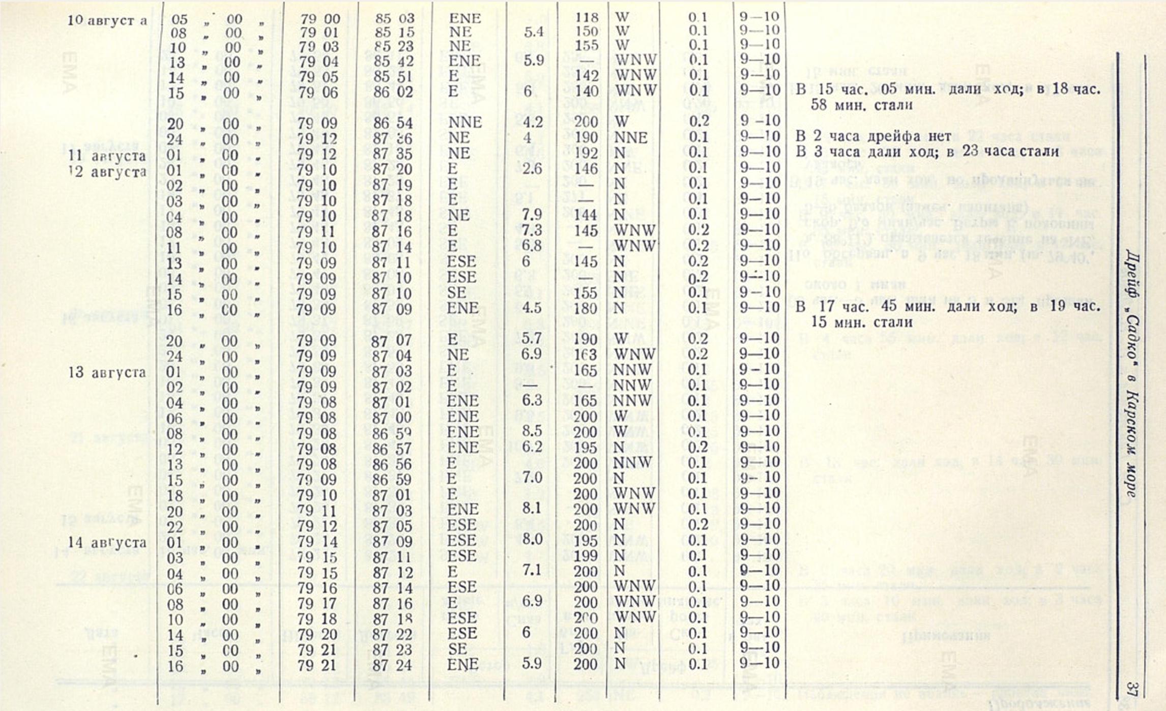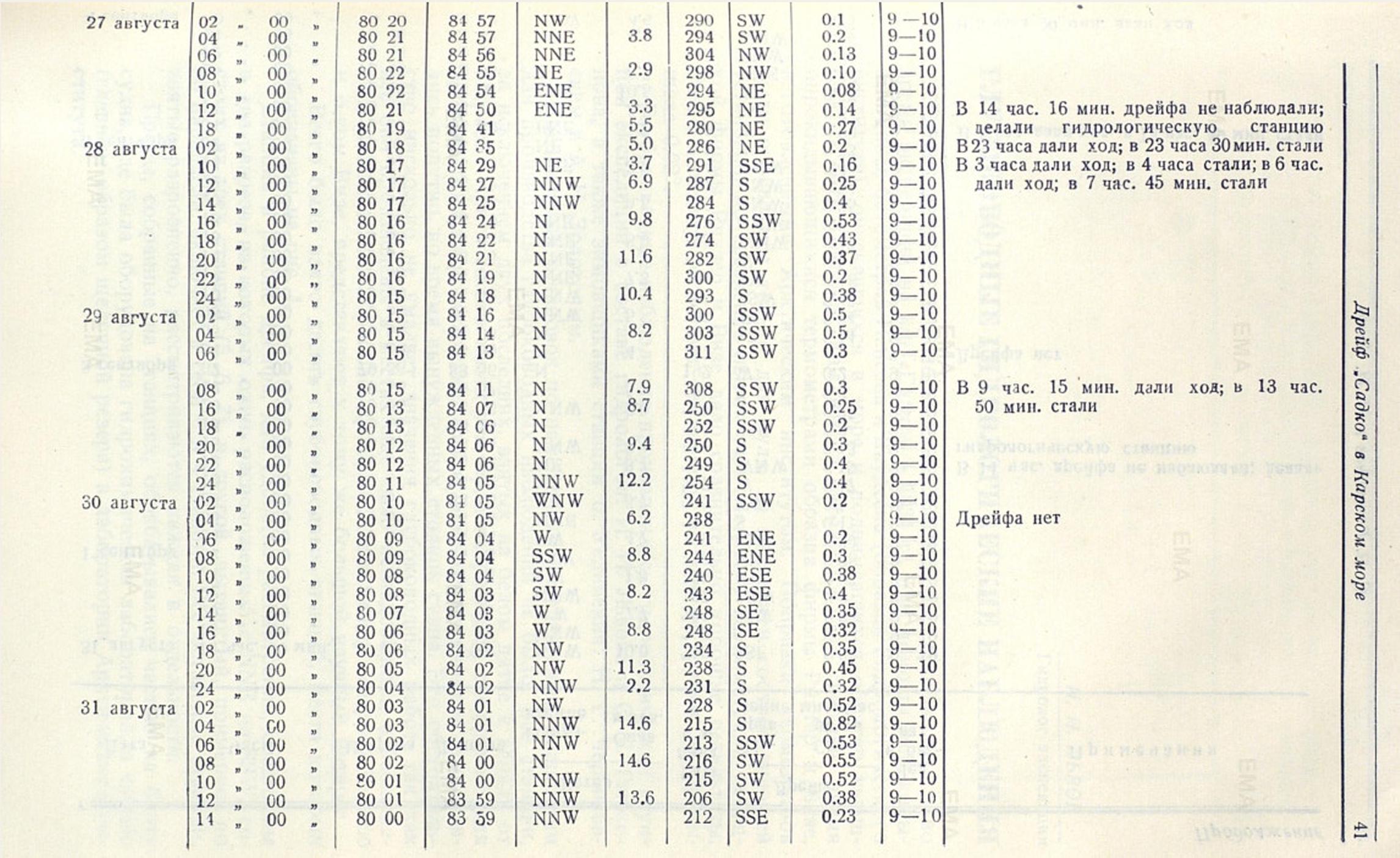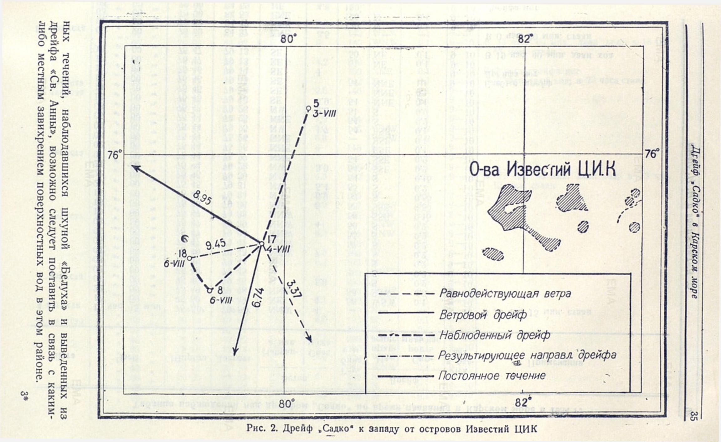 Рассмотрев постоянное течение, выведенное нами из дрейфа «Садко», и сравнив его с наблюдениями, имевшимися ранее в прилегающих к месту дрейфа районах, усматривается в общих чертах некоторая гармония в направлении течений. Так, по наблюдениям шхуны «Белуха» в 1933 г. в районе к юго-западу от о. Свердруп (широта 74°21' N долгота 78°26' Е) постоянное течение на глубине 5 м. было N 32° W и скорость 14. 9 мили в сутки; к югу от о. Уединения (широта 77°25' N и долгота 81°58' Е) в том же году «Белухой» наблюдалось постоянное течение N 13° Е и скорость 26. 4 мили в сутки, а при анализе дрейфа «Св. Анны» в 80 милях к западу от района дрейфа «Садко» В. Ю. Визе показал, что в этом районе существует постоянное течение, приблизительно N 6° W направления со скоростью 0. 78 мили в сутки.