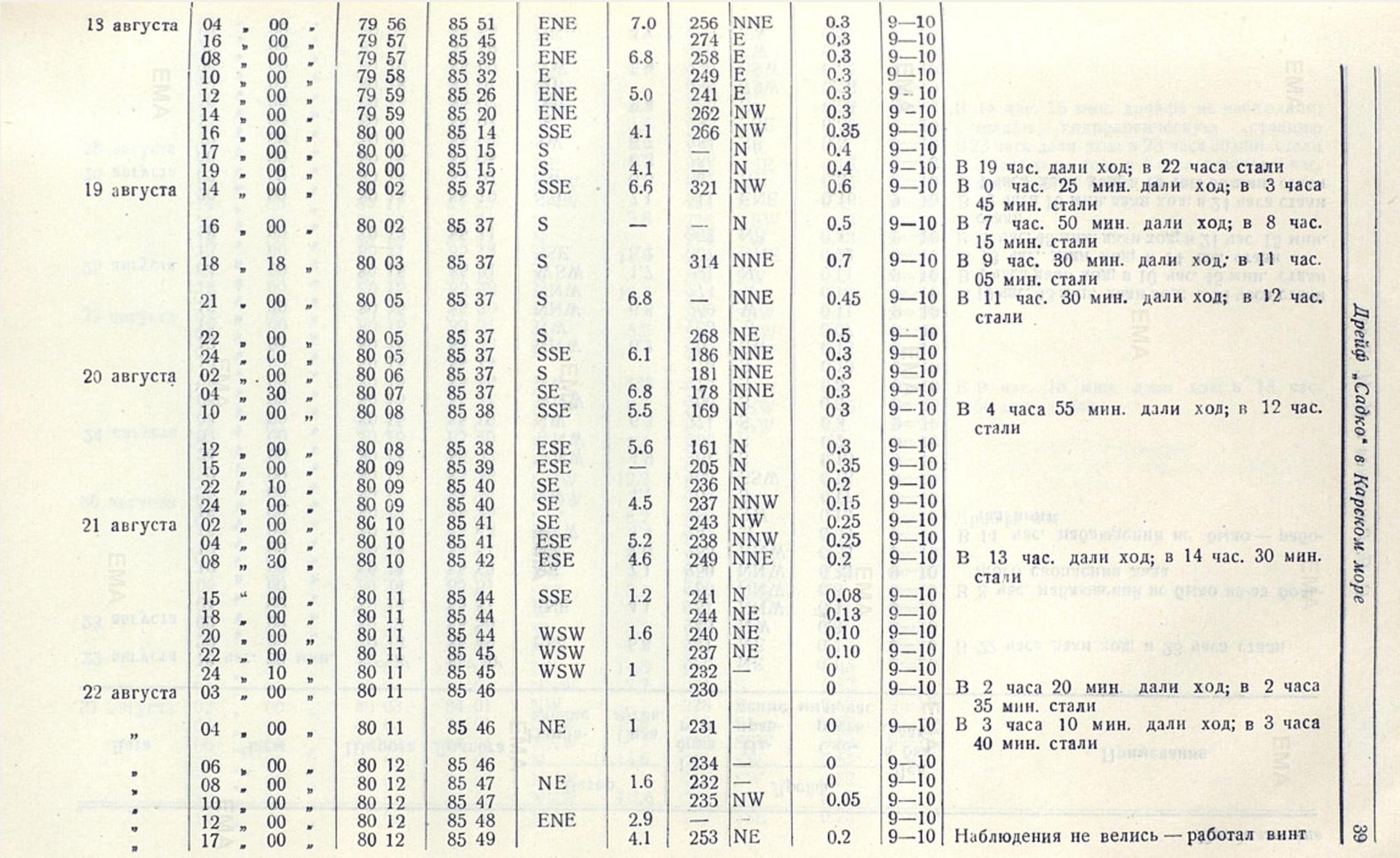* Необходимо заметить, что и последующие опорные пункты не особенно надежны. Обсервации по солнцу 4 августа сделаны при неблагоприятном горизонте и дали у гидрографа Е. С. Гернета и ст. пом. капитана Ножкина отличающиеся результаты. конечная точка дрейфа в 18 час. 6 августа получена обратной прокладкой от обсервации 7 августа. Наконец точка, где наблюдение дрейфа резко изменило свое направление с SW на (8 час. 6 августа), получена счислением и мало надежна, хотя судовая обсервация, произведенная в 11 час. 6 августа, совпала с ней.