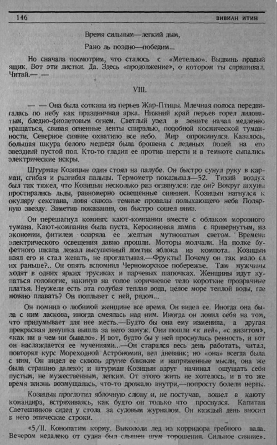 — — Она была соткана из перьев Жар-Птицы. Млечная полоса передвигалась по небу как праздничная арка. Нижний край перьев горел лиловатым, бледно-фиолетовым огнем. Светлый узел в зените начал медленно вращаться, свивая огненные ленты спиралью, подобной космической туманности. Северное сияние охватило все небо. Мир опрокинулся. Казалось, большая шкура белого медведя была брошена с ледяных полей на его звездный пустой пол. Кто-то гладил ее против шерсти и в темноте сыпались электрические искры.