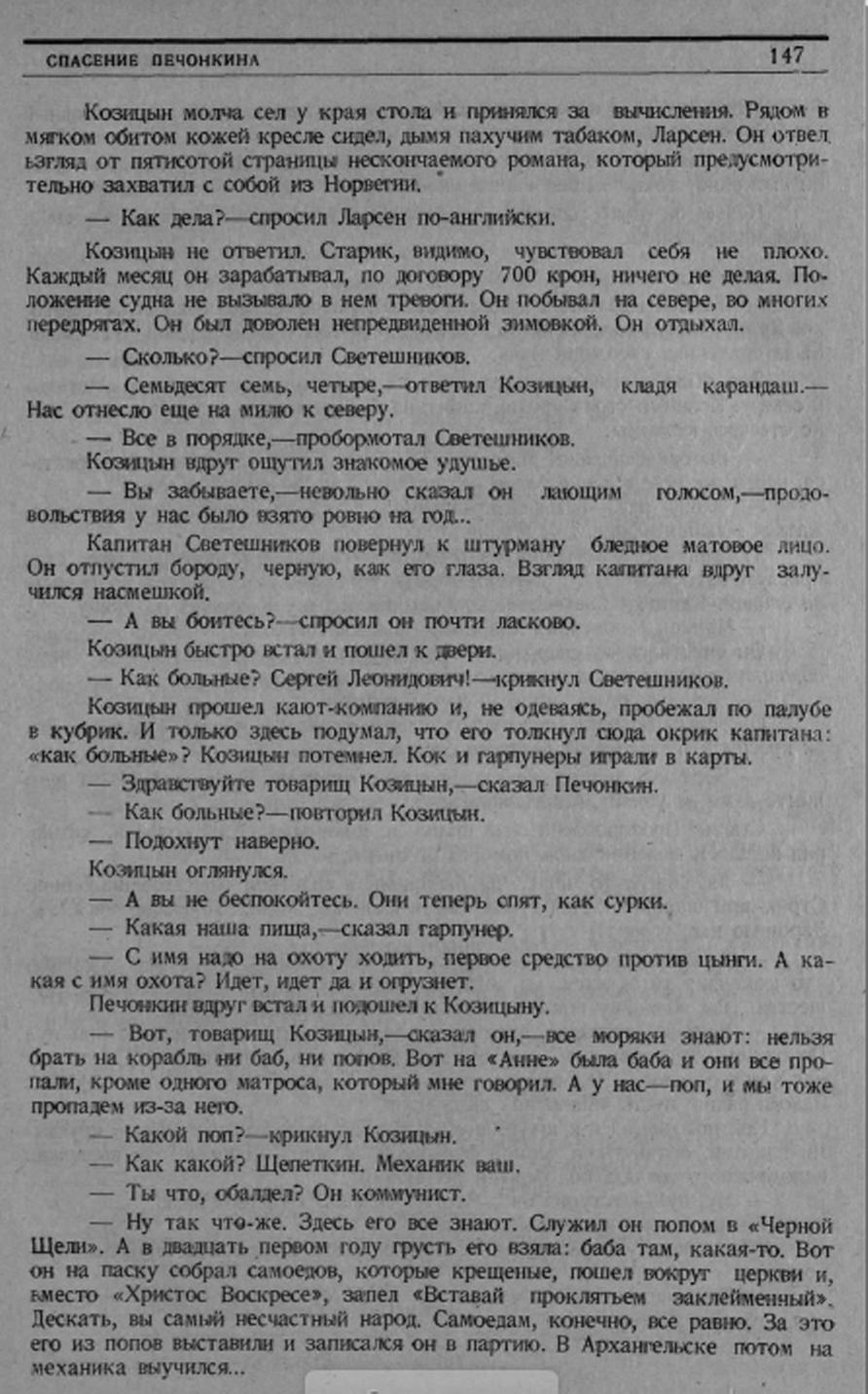 — Ну так что-же. Здесь его все знают. Служил он попом в «Черной Щели». А в двадцать первом году грусть его взяла: баба там, какая-то. Вот он на паску собрал самоедов, которые крещеные, пошел вокруг церкви и, вместо «Христос Воскресе», запел «Вставай проклятьем заклейменный». Дескать, вы самый несчастный народ. Самоедам, конечно, все равно. За это его из попов выставили и записался он в партию. В Архангельске потом на механика выучился...