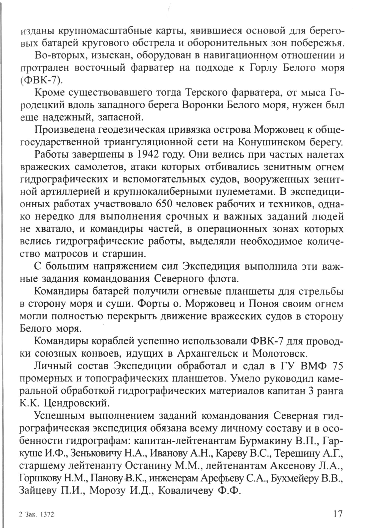 Успешным выполнением заданий командования Северная гидрографическая экспедиция обязана всему личному составу и в особенности гидрографам: капитан-лейтенантам Бурмакину В. П., Гаркуше И. Ф., Зеньковичу Н. А., Иванову А. Н., Кареву B.C., Терешину А. Г., старшему лейтенанту Останину М. М., лейтенантам Аксенову Л. А., Горшкову Н. М., Панову В. К., инженерам Арефьеву С. А., Бухмейеру В.В., Зайцеву П. И., Морозу И. Д., Коваличеву Ф. Ф.