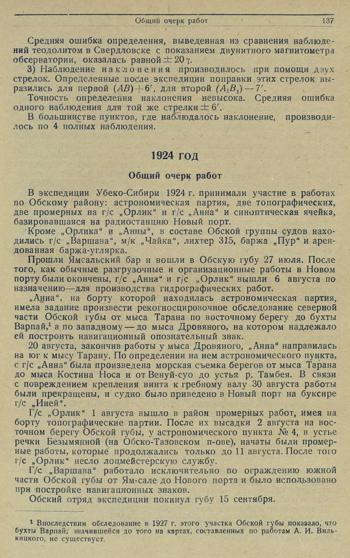 В экспедиции Убеко-Сибири 1924 г. принимали участие в работах по Обскому району: астрономическая партия, две топографических, две промерных на г/с „Орлик" и r/с „Анна" и синоптическая ячейка, базировавшаяся на радиостанцию Новый порт.