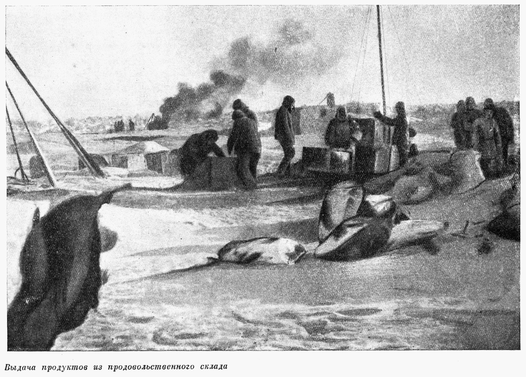 Володя вышел. За ним я. Недалеко от палатки чернеет нарта, вокруг нее сутулятся люди. Скучное, серое небо; ветер жестоко теребит флаг; колюче выплясывает поземка.
