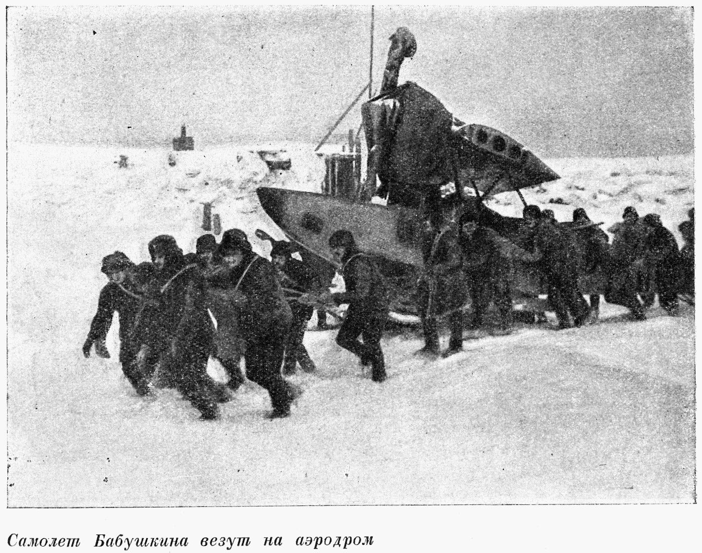 На следующий день вечером нам сообщили: "Площадка готова". Мы встаем в два часа ночи, готовим машины. Утром из Уэллена прилетает Слепнев, а за ним Каманин и Молоков. Теперь у нас три машины. Самолет Слепнева разгружается. В это время Каманин с штурманом Шелыгановым и Молоков выруливают на старт, чтобы лететь в лагерь. Вслед за ними, разгрузив машину и погрузив собак и нарты, вылетит Слепнев с Ушаковым.
