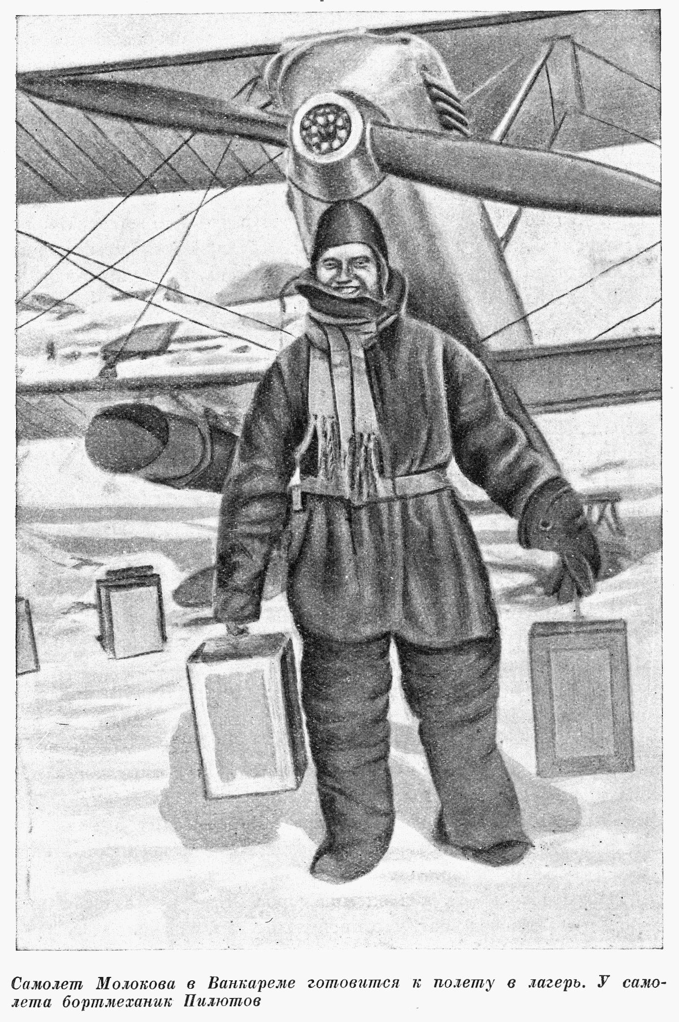 Все ближе и ближе самолеты, но в лагере тревожно. Радио сообщает, что из пяти самолетов группы т. Каманина три прилетели в Анадырь, а два из-за тумана не могли пробиться и остались в Наварине. Следующая радиограмма еще тревожнее: т. Каманин вылетел с тремя самолетами в Ванкарем и... пропал. О нем нет сведений три дня. Новая радиограмма: с Аляски, из Нома, вылетел т. Леваневский, но во время его полета в Ванкареме резко ухудшилась погода, началась пурга. Колючинская губа покрылась туманом. Летчик Леваневский, попадая в туман, пробивается кверху, чтобы уйти от гор. Но недаром туман в полярных условиях называют бичом авиации: самолет быстро покрывается льдом, тяжелеет, теряет летучесть, его тянет вниз. Только спокойствие т. Леваневского и его опыт спасают жизнь ему, его бортмеханику и известному полярнику т. Ушакову, который находился на самолете в качестве уполномоченного правительственной комиссии по спасению челюскинцев.