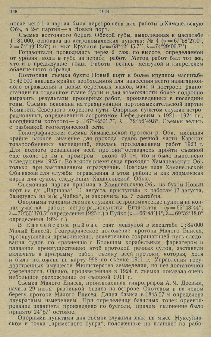 Съемка восточного берега Обской губы, выполненная в масштабе 1:84000, основана на астрономических пунктах: № 4 (φ = 67°58'27. 0", λ = 74°49'12.6") и мыс Круглый (φ = 68°42'15.7"; λ = 74°29'06.7").