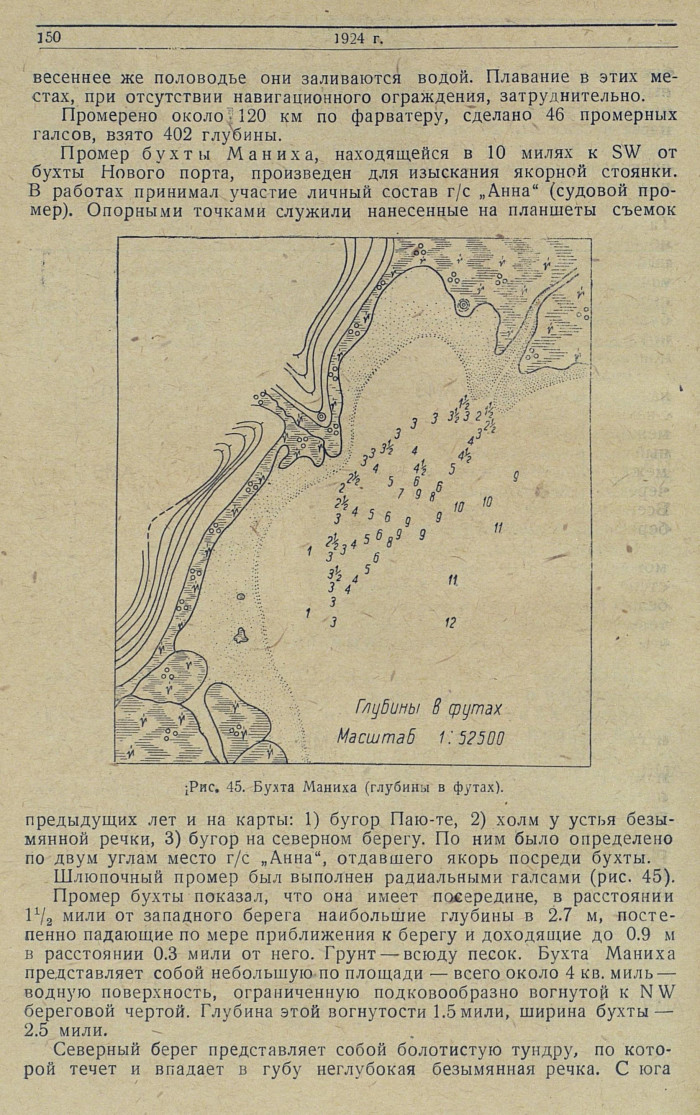 Промер бухты Маниха, находящейся в 10 милях к SW от бухты Нового порта, произведен для изыскания якорной стоянки. В работах принимал участие личный состав г/с „Анна" (судовой промер). Опорными точками служили нанесенные на планшеты съемок