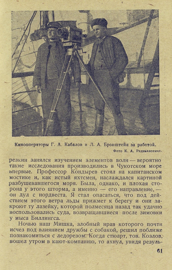 Ночью наш Мишка, злобный нрав которого почти исчез под влиянием дружбы с собакой, решил поближе познакомиться с ледорезом. Когда стюарт, тов. Козлов, вошел утром в кают-компанию, то ахнул, увидя резуль-