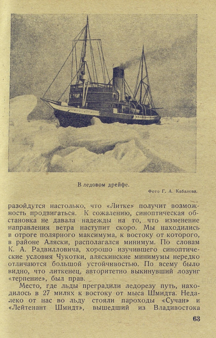 разойдутся настолько, что «Литке» получит возможность продвигаться. К сожалению, синоптическая обстановка не давала надежды на то, что изменение направления ветра наступит скоро. Мы находились в отроге полярного максимума, к востоку от которого, в районе Аляски, располагался минимум. По словам К. А. Радвилловича, хорошо изучившего синоптические условия Чукотки, аляскинские минимумы нередко отличаются большой устойчивостью. По всему было видно, что литкенец, авторитетно выкинувший лозунг «терпение», был прав.