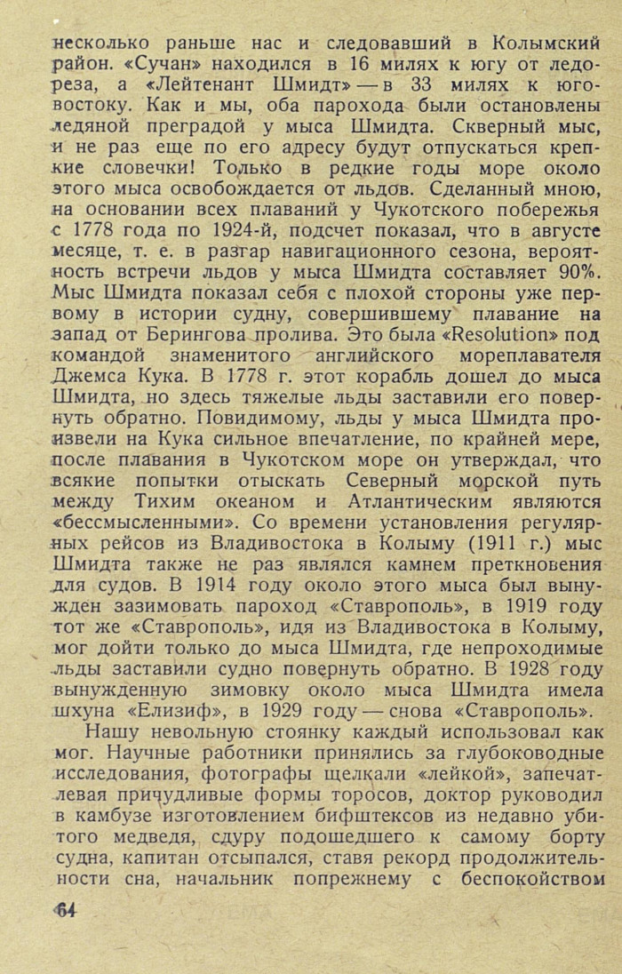 несколько раньше нас и следовавший в Колымский район. «Сучан» находился в 16 милях к югу от ледореза, а «Лейтенант Шмидт» — в 33 милях к юго-востоку. Как и мы, оба парохода были остановлены ледяной преградой у мыса Шмидта. Скверный мыс, и не раз еще по его адресу будут отпускаться крепкие словечки! Только в редкие годы море около этого мыса освобождается от льдов. Сделанный мною, на основании всех плаваний у Чукотского побережья с 1778 года по 1924-й, подсчет показал, что в августе месяце, т. е. в разгар навигационного сезона, вероятность встречи льдов у мыса Шмидта составляет 90%. Мыс Шмидта показал себя с плохой стороны уже первому в истории судну, совершившему плавание на запад от Берингова пролива. Это была «Resolution» под командой знаменитого английского мореплавателя Джемса Кука. В 1778 г. этот корабль дошел до мыса Шмидта, но здесь тяжелые льды заставили его повернуть обратно. Повидимому, льды у мыса Шмидта произвели на Кука сильное впечатление, по крайней мере, после плавания в Чукотском море он утверждал, что всякие попытки отыскать Северный морской путь между Тихим океаном и Атлантическим являются «бессмысленными». Со времени установления регулярных рейсов из Владивостока в Колыму (1911 г. ) мыс Шмидта также не раз являлся камнем преткновения для судов. В 1914 году около этого мыса был вынужден зазимовать пароход «Ставрополь», в 1919 году тот же «Ставрополь», идя из Владивостока в Колыму, мог дойти только до мыса Шмидта, где непроходимые льды заставили судно повернуть обратно. В 1928 году вынужденную зимовку около мыса Шмидта имела шхуна «Елизиф», в 1929 году — снова «Ставрополь».