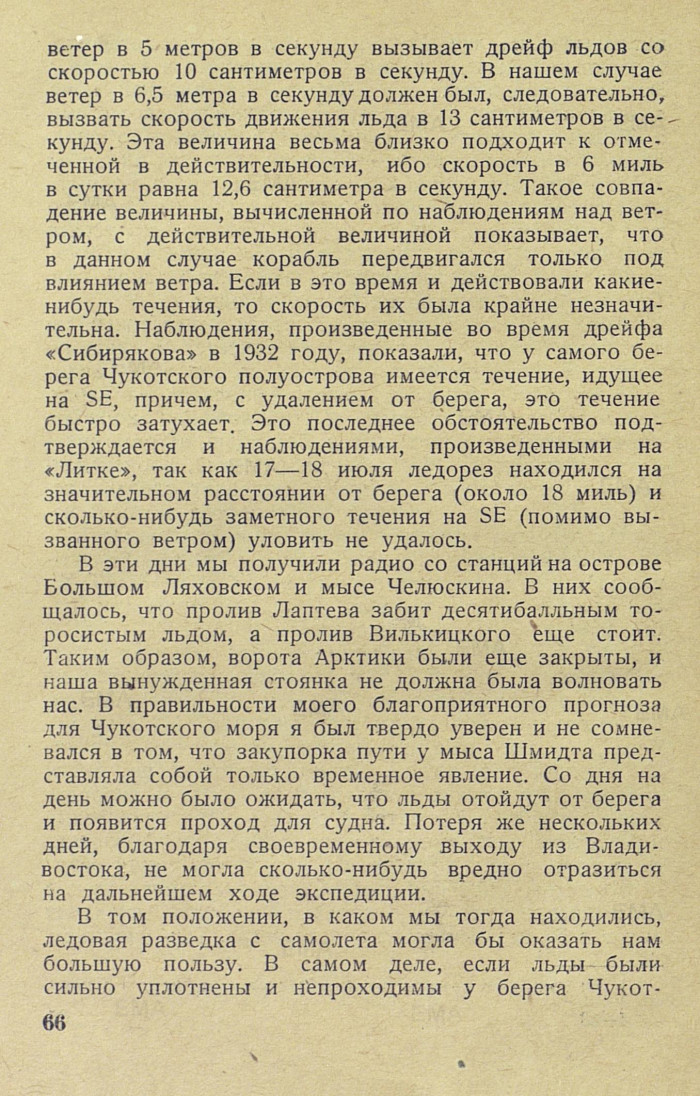 жился. Капитан приказал пускать из пароходной трубы густой черный дым; на мостике вахтенный штурман беспрестанно обшаривал горизонт биноклем. Через каждые полчаса мы запрашивали станцию на мысе Шмидта, но самолет и там не показывался. Что могло с ним приключиться? В голову приходили разные предположения, но наиболее вероятным казалось, что самолет имел на пути вынужденную посадку, вследствие порчи мотора. Было решено ждать до полудня, а затем итти ледорезом на поиски пропавших. На мысе Шмидта к поискам готовился летчик Фарих. Предположение, что и на этот раз самолет заблудился и не мог найти «Литке», большинством отвергалось, как малоправдоподобное. Перед стартом самолета с мыса Шмидта мы сообщили Д. С. Дуплицкому точное местоположение корабля, вместе с курсом, который самолет должен был взять. Единственный на корабле, кто не обнаруживал ни малейших признаков беспокойства, был бортмеханик Куква. «Не понимаю, зачем волноваться? — заявил он. — Вы просто не знаете Куканыча! Это такой человек, что из любой переделки сухим выйдет. Шли бы спать, а за Куканыча не тревожьтесь».