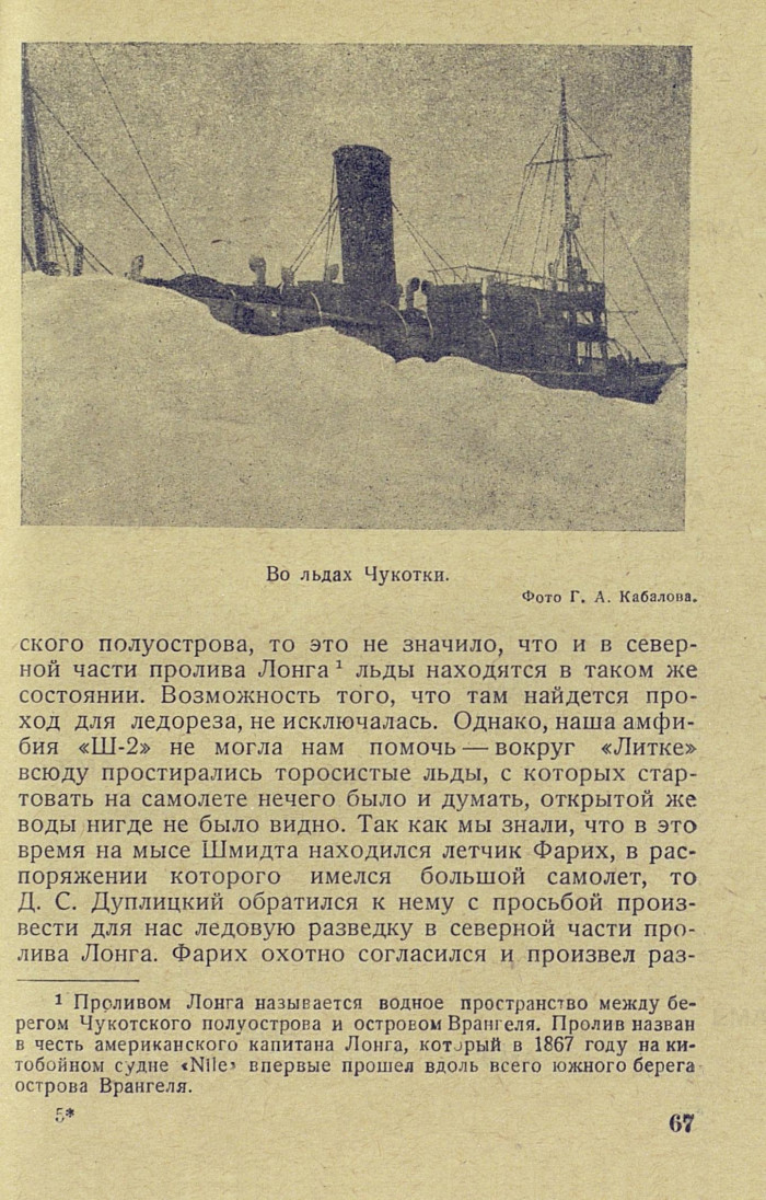 ского полуострова, то это не значило, что и в северной части пролива Лонга {1} льды находятся в таком же состоянии. Возможность того, что там найдется проход для ледореза, не исключалась. Однако, наша амфибия «Ш-2» не могла нам помочь — вокруг «Литке» всюду простирались торосистые льды, с которых стартовать на самолете нечего было и думать, открытой же воды нигде не было видно. Так как мы знали, что в это время на мысе Шмидта находился летчик Фарих, в распоряжении которого имелся большой самолет, то Д. С. Дуплицкий обратился к нему с просьбой произвести для нас ледовую разведку в северной части пролива Лонга. Фарих охотно согласился и произвел раз-