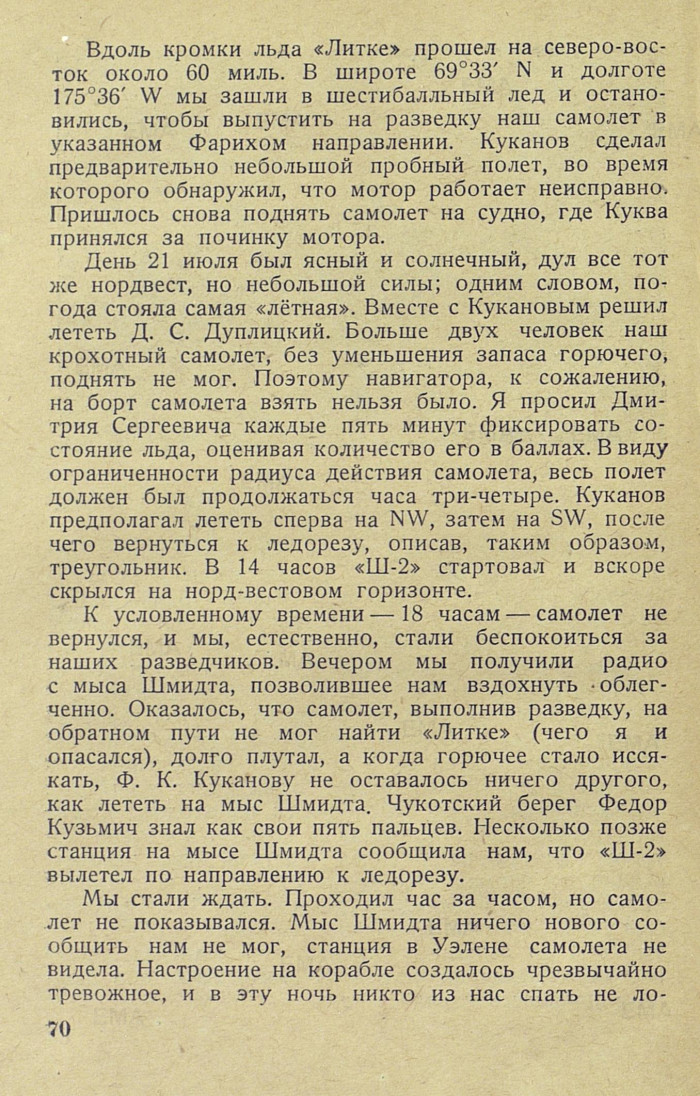ведку 18 июля. В результате ее он сообщил нам по радио следующее: «В районе мыса Шмидта мелкобитый лед 10 баллов. От 177° W до 178° 12' W, параллельно берегу, в 25 милях от него находится чистая вода с обломками полей. От 178° 12' W вода продолжается на NW до острова Врангеля, далее поворачивает на WNW и тянется до видимого горизонта. От 177° W на Е вода тянется тоже до горизонта. Проход судов возможен». Как впоследствии выяснилось, Фарих на своем сухопутном самолете не летал над самим проливом Лонга, а только поднялся над чукотским берегом на значительную высоту, откуда и обозревал море.