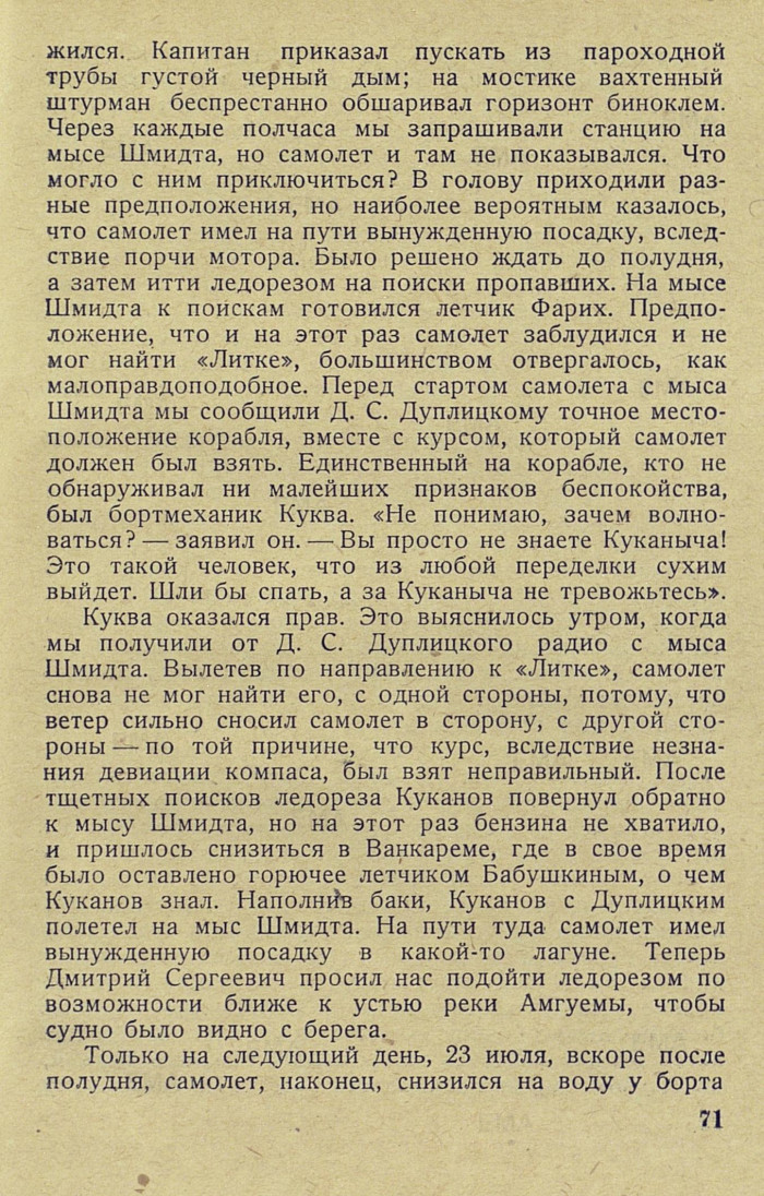 Куква оказался прав. Это выяснилось утром, когда мы получили от Д. С. Дуплицкого радио с мыса Шмидта. Вылетев по направлению к «Литке», самолет снова не мог найти его, с одной стороны, потому, что ветер сильно сносил самолет в сторону, с другой стороны — по той причине, что курс, вследствие незнания девиации компаса, был взят неправильный. После тщетных поисков ледореза Куканов повернул обратно к мысу Шмидта, но на этот раз бензина не хватило, и пришлось снизиться в Ванкареме, где в свое время было оставлено горючее летчиком Бабушкиным, о чем Куканов знал. Наполнив баки, Куканов с Дуплицким полетел на мыс Шмидта. На пути туда самолет имел вынужденную посадку в какой-то лагуне. Теперь Дмитрий Сергеевич просил нас подойти ледорезом по возможности ближе к устью реки Амгуемы, чтобы судно было видно с берега.