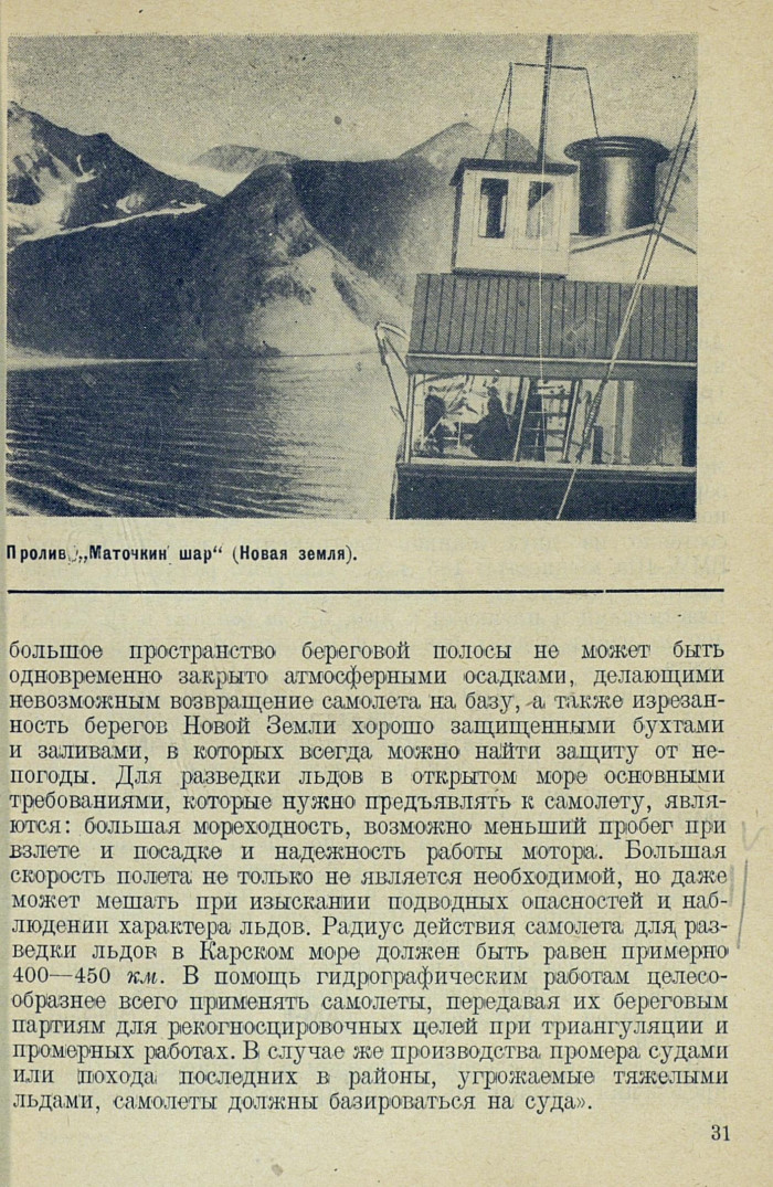 большое пространство береговой полосы не может быть одновременно закрыто атмосферными осадками, делающими невозможным возвращение самолета на базу, -а также изрезанность берегов Новой Земли хорошо защищенными бухтами и заливами, в которых всегда можно найти защиту от непогоды. Для разведки льдов в открытом море основными требованиями, которые нужно предъявлять к самолету, являются: большая мореходность, возможно меньший пробег при взлете и посадке и надежность работы мотора. Большая скорость полета не только не является необходимой, но даже может мешать при изыскании подводных опасностей и наблюдении характера льдов. Радиус действия самолета для разведки льдов в Карском море должен быть равен примерно 400—450 км. В помощь гидрографическим работам целесообразнее всего применять самолеты, передавая их береговым партиям для рекогносцировочных целей при триангуляции и промерных работах. В случае же производства промера судами или похода последних в районы, угрожаемые тяжелыми льдами, самолеты должны базироваться на суда».