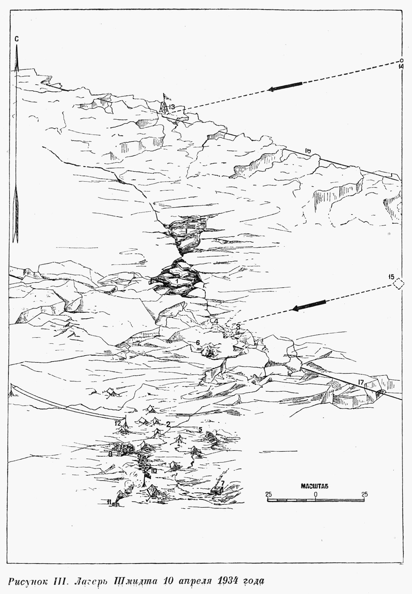 В пять часов вечера, когда женщины с Ляпидевским уже улетели, в лагере началась подвижка льда. Лагерная трещина стала расходиться, а льдина с бараком (рис. I, обозн. 2) стала перемешаться в сторону, на восток.