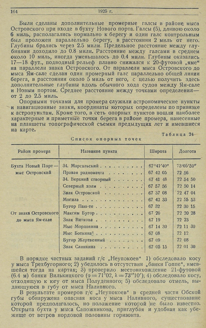 Были сделаны дополнительные промерные галсы в районе мыса Островского при входе в бухту Нового порта. Галсы (5), длиною около 6 миль, располагались нормально к берегу и один галс контрольным был проложен параллельно берегу, в расстоянии 2 миль от него. Глубины брались через 2.5 мили. Предельное расстояние между глубинами доходило до 0.8 мили. Расстояние между галсами в среднем около 10 миль, иногда уменьшалось до 0.4 мили. Глубины оказались 17—18 фут., подводный рельеф плавно снижался к 20-футовой „яме" на параллели знака Островского. От параллели мыса Островского до мыса Ям-сале сделан один промерный галс параллельно общей линии берега, в расстоянии около 5 миль от него, с целью получить здесь дополнительные глубины вдоль обычного хода судов между Ям-сале и Новым портом. Среднее расстояние между точками определения — от 2 до 2.5 миль.