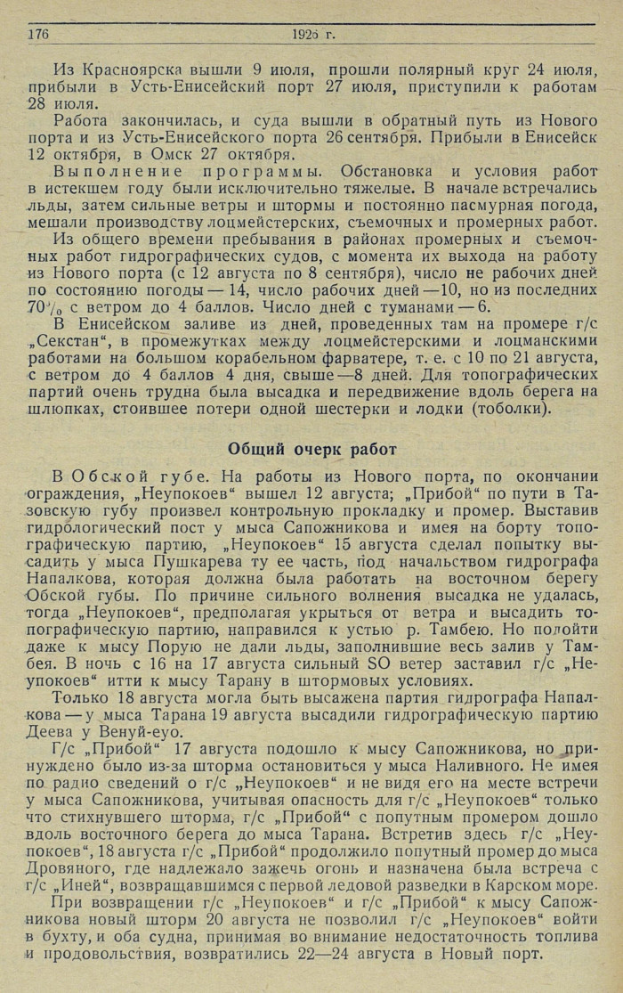 В Обской губе. На работы из Нового порта, по окончании ограждения, „Неупокоев" вышел 12 августа; „Прибой" по пути в Тазовскую губу произвел контрольную прокладку и промер. Выставив гидрологический пост у мыса Сапожникова и имея на борту топографическую партию, „Неупокоев" 15 августа сделал попытку высадить у мыса Пушкарева ту ее часть, под начальством гидрографа Напалкова, которая должна была работать на восточном берегу Обской губы. По причине сильного волнения высадка не удалась, тогда „Неупокоев", предполагая укрыться от ветра и высадить топографическую партию, направился к устью р. Тамбею. Но подойти даже к мысу Порую не дали льды, заполнившие весь залив у Тамбея. В ночь с 16 на 17 августа сильный SO ветер заставил г/с „Неупокоев" итти к мысу Тарану в штормовых условиях.