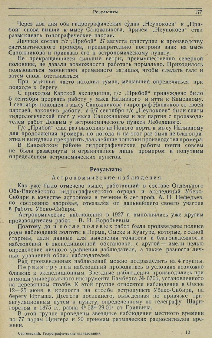 С приходом Карской экспедиции, г/с „Прибой" принуждено было 5 сентября прервать работу у мыса Наливного и итти к Каменному. 1 сентября подошел к мысу Сапожникова гидрограф Напалков со своей партией, закончив работу, а 6/7 сентября г/с „Неупокоев" были сняты гидрологический пост у мыса Сапожникова и вся партия с производителем работ Деевым у астрономического пункта Лебединого.