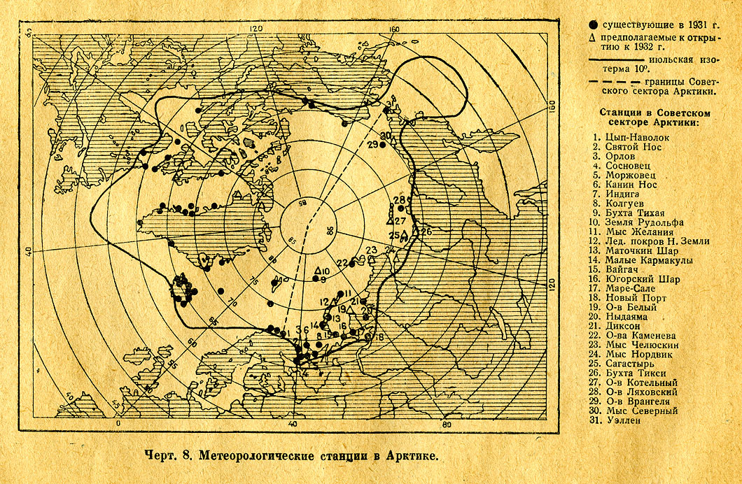 На карте (черт. 8) показаны существующие в настоящее время полярные станции в Арктике и предполагаемые к открытию в 1932 году. При составлении этой карты мы приняли за границу полярной области июльскую изотерму 10° С, т.е. линию, соединяющую все места, где средняя температура воздуха в июле равна 10° С. Станции, лежащие южнее этой линии, на карте не показаны. Сравнивая эту карту с картой станций Первого международного полярного года, мы видим, что число уже существующих в настоящее время в Арктике постоянных станций много превышает число станций, действовавших пятьдесят лет тому назад. В настоящее время мы имеем в Арктике пятьдесят восемь станций (в Первом международном полярном году их было только тринадцать), и в 1932 г. предположено открыть еще семнадцать станций (из которых девять в Советском секторе Арктики). Между прочим, американцы предполагают устроить обсерваторию в форте Конгер, где в течение Первого международного полярного года действовала станция под начальством Грили. Осуществить этот проект предположено на частные средства.
