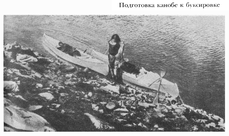 Теперь бы следовало попробовать идти бечевой. Однако обычный способ, когда один человек сидит в лодке и правит, а другие тянут бечеву, для нас непригоден. Это слишком медленно и сложно. Придется проходить каждый участок трижды, возвращаясь за оставленным. Мы решили применить другой способ, позволяющий буксировать каждому свою канобе самостоятельно. Для этого концы бечевы длиной 20 — 25 метров прикрепили к ручкам на носу и корме лодки, а середину буксировщик перекидывал через плечо. Идя по берегу и ведя свою посудину по воде, можно было ею управлять, обходя береговые препятствия вроде подводных камней, уступов. Для этого стоило только потянуть к себе кормовой конец бечевы, как нос, отжимаемый быстрым течением, отворачивал к середине реки, и канобе отходила от берега так, как это было нужно, и как позволяла длина бечевы. При подтягивании носового конца бечевы отжималась корма, и лодка сама подходила к берегу. Однако такой способ пригоден только на реках с быстрым течением, таких, как Хантайка, и только для таких легких суденышек, как наши. Более крупные лодки при такой буксировке просто не хватит сил удержать.