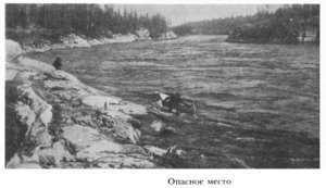 Глубина такая, что, несмотря на исключительную прозрачность воды, дна не было видно. По берегам известняковые скалы высотой до 10 — 20 метров, а над ними — тайга, густые заросли кустарников, бурелом. Верхом не пройти. Пришлось пробираться у воды, как это ни трудно. Бечевника почти не было. Каменные, отполированные льдом скользкие склоны косо уходили прямо в воду. Наиболее крепкие пласты известняка далеко вдавались в реку, образуя мысы, около которых возникало особенно быстрое течение, доходящее местами почти до середины реки. Перед ними, ниже по течению, стояли улова с довольно тихим и даже обратным течением.