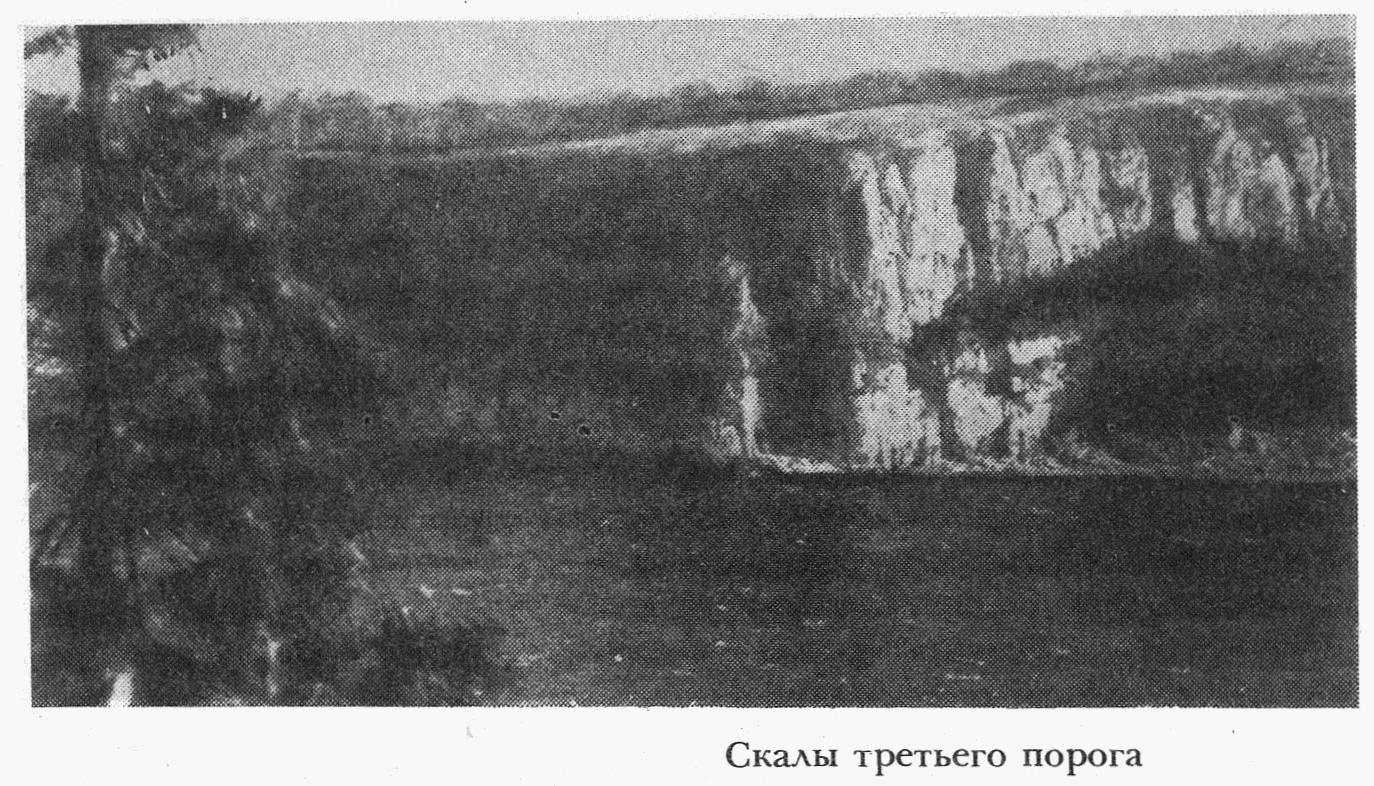 За неделю прошли всего 26 километров. Далее известняки сменились более мягкими мергелистыми породами. Русло реки расширилось, течение стало спокойнее. С удовольствием пересели на весла и вскоре миновали устье, видимо небольшой, впадающей справа речки, которую назвали Скалистой, так как устье ее представляет собой сплошное обнажение известняков. Километра через два русло опять сузилось, послышался шум воды, и мы подошли к новому, второму порогу. Пришлось сделать остановку, осмотреть порог, выяснить, как лучше через него перебраться. Кроме того, пора было определять астрономический пункт. Съемка наша фрагментарна, а поэтому возникала необходимость в более частом определении опорных пунктов.
