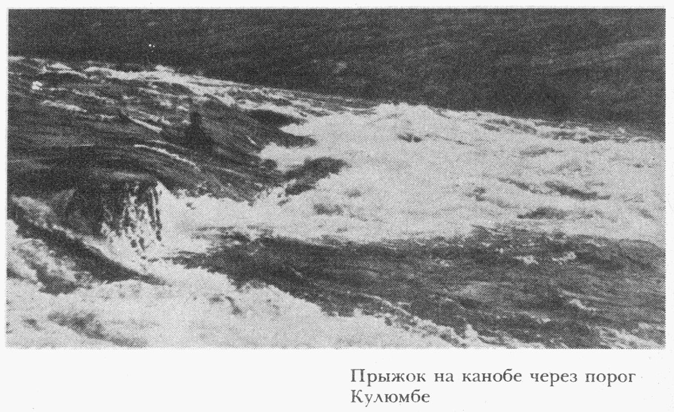 Без остановок дошли до устья Кулюмбе, повернули в Хантайку и спустились вниз, до начала первого порога. Здесь решили осмотреться. И хотя мы уверовали в себя и в надежность наших канобе, но плыть сейчас через такой порог, как этот, было бы, по меньшей мере, неосмотрительно. На другой день прошли вдоль всего порога, как по правому, так и по левому берегу. Вода значительно спала, обнажились те камни, вокруг которых, переливаясь и бешено крутясь, мчались вешние воды. При входе в порог, под правым берегом, виден довольно значительный водоворот, а дальше посередине — быстрое, но ровное течение. Крупных подводных камней здесь, видимо, нет. Стиснутая скалами река текла теперь ровным широким каскадом в тихий плес подпорожья. Если строго держаться главной струи в русле, то без риска можно попасть в среднюю часть каскада и спуститься, не задев за скалы. Ширина створа была метров 25. Спуск следовало начать ниже водоворота, у входа в порог. На том и порешили. Спустились поочередно без особых приключений. Держались основной струи в средней части русла. Быстрое течение выносило каждого в середину водослива. Лодка без прыжка ныряла носом в воду. Вал с головой покрывал человека. Позже, подъезжая к берегу, я почувствовал, что сижу в воде. Вылез и обнаружил в чехле канобе долевой, почти полуметровый разрез. Очевидно, где-то чиркнув острый камень. Однако воды внутрь набралось немного, так как фартук был наглухо завязан.