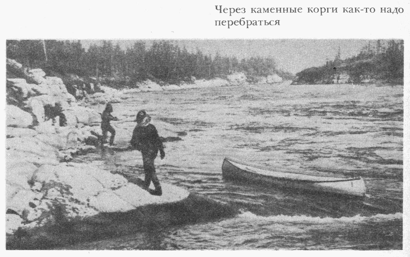 Шли очень медленно. Каждый километр, местами даже сотню метров, брали с бою. Карабкались по берегам, цеплялись, как кошки, за выступы скал, за корни деревьев, за кусты, скользили и падали на гладких камнях, нередко срывались в воду, но бечеву из рук не выпускали. Местами, где порожистый перебор на мысах был особенно силен, перебирались на другую сторону, куда корга не доходила и где течение немного тише. С превеликим трудом проходили три, от силы пять километров в день. Как ни берегли канобе, повреждений не избежали. Страдала на камнях брезентовая обшивка. Каркасы целы, в них нет ни поломок, ни трещин — они сделаны из прочного бука. Вещи, конечно, подмокали, но погода стояла хорошая, сухая, и на стоянках все быстро просыхало. Комаров здесь было мало, их сдувал сильный ветер. Обувь на острых выступах и шероховатых, как рашпили, пластах известняков рвалась необычайно быстро, а материала для ремонта у нас было мало. Пустили на подошвы голенища сапог, а вместо дратвы — антенный канатик. Особенно рвалась обувь у Виктора Александровича. Он всегда впереди, и его сапогам доставалось больше всех.