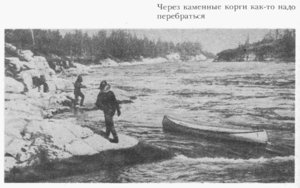 Проводка канобе из тихого течения улова через бурный поток у мыса требовала больших усилий: двое тянули бечеву, а третий подстраховывал бечевой корму. Сначала надо было отпустить лодку как можно дальше в реку, затем быстро пересечь перебор и подтянуть ее к берегу. Канобе, поджимаемые течением, ложились на борт, и только потому, что были закрыты плотно завязанными фартуками, вода в них не попадала. Однако в наиболее опасных местах радиоприемник, теодолит, бумаги и прочие особенно боящиеся сырости вещи переносили на руках.