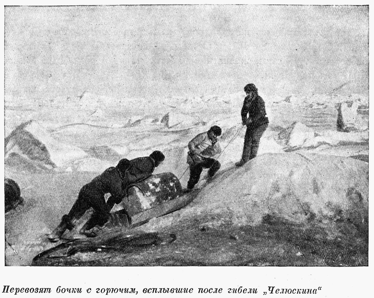 Челюскинцы собрались вокруг находки, радуясь развлечению и горя нетерпеньем узнать содержимое бочки.