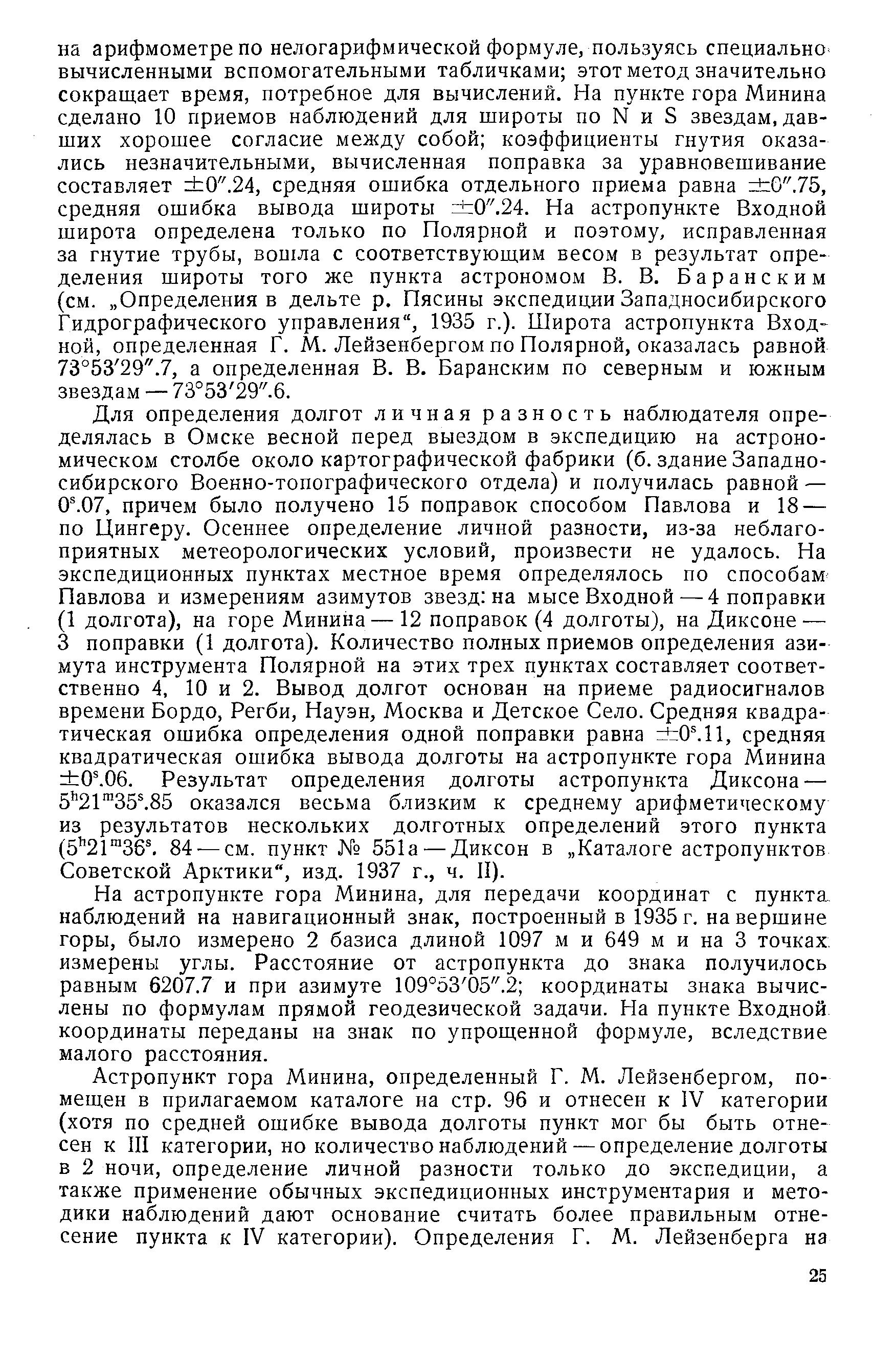 На экспедиционных астропунктах широта определялась измерением близмеридиональных зенитных расстояний звезд на севере и на юге, с отсчетами термометра и барометра для введения поправки за рефракцию; на каждую наблюдаемую звезду делалось по 8 наведений. Следует указать, что в вычислениях широты по зенитным расстояниям Г. М. Лейзенберг применил удобный метод вычисления на арифмометре по нелогарифмической формуле, пользуясь специально вычисленными вспомогательными табличками; этот метод значительно сокращает время, потребное для вычислений. На пункте гора Минина сделано 10 приемов наблюдений для широты по N и S звездам, давших хорошее согласие между собой; коэффициенты гнутия оказались незначительными, вычисленная поправка за уравновешивание составляет ±0".24, средняя ошибка отдельного приема равна ±0".75, средняя ошибка вывода широты ±0".24. На астропункте Входной широта определена только по Полярной и поэтому, исправленная за гнутие трубы, вошла с соответствующим весом в результат определения широты того же пункта астрономом В. В. Баранским (см. „Определения в дельте р. Пясины экспедиции Западносибирского Гидрографического управления", 1935 г. ). Широта астропункта Входной, определенная Г. М. Лейзенбергом по Полярной, оказалась равной 73°53'29".7, а определенная В. В. Баранским по северным и южным звездам — 73°53'29".6.